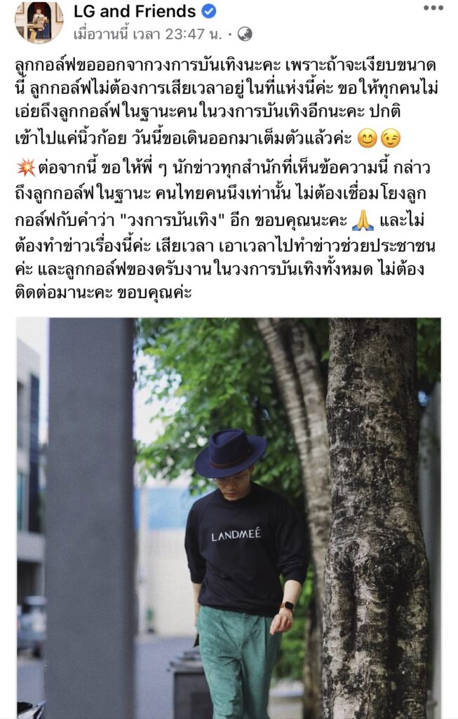 ต่อจากนี้ ขอให้พี่ๆ นักข่าวทุกสำนักที่เห็นข้อความนี้ กล่าวถึงลูกกอล์ฟในฐานะ คนไทยคนนึงเท่านั้น ไม่ต้องเชื่อมโยงลูกกอล์ฟกับคำว่า “วงการบันเทิง” อีก ขอบคุณนะคะ และไม่ต้องทำข่าวเรื่องนี้ค่ะ เสียเวลา เอาเวลาไปทำข่าวช่วยประชาชนค่ะ และลูกกอล์ฟของดรับงานในวงการบันเทิงทั้งหมด ไม่ต้องติดต่อมานะคะ ขอบคุณค่ะ”