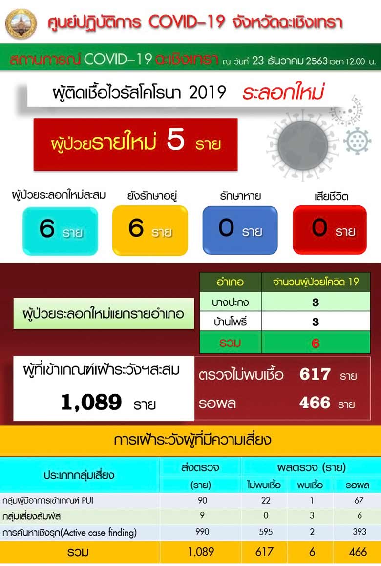 สำนักงานประชาสัมพันธ์จังหวัดฉะเชิงเทรา จากศูนย์สายด่วนโควิด19 ฉะเชิงเทราเผย ว่า ขณะนี้มีผู้ติดเชื้อเพิ่มเติมในพื้นที่ จ.ฉะเชิงเทรา อีกจำนวน 5 รายรวมยอดสะสมต่อเนื่องเป็น 6 รายแล้ว โดยเป็นชาว อ.บ้านโพธิ์ 3 ราย และ อ.บางปะกง 2 ราย โดยทราบข้อมูลที่แน่ชัดเพียงรายเดียว ซึ่งเป็นชายอายุ 43 ปี อาชีพรับจ้างขึ้นกุ้ง (รับเหมาจับกุ้งจากบ่อเลี้ยงส่งไปขายยังแพ)