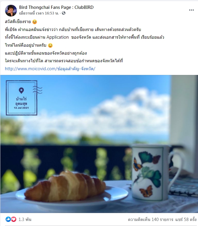 “สวัสดีเชียงราย พี่เบิร์ด กลับบ้านที่เชียงราย เดินทางด้วยรถส่วนตัวครับ ทั้งนี้ได้ลงทะเบียนผ่าน Application ของจังหวัด และส่งเอกสารให้ทางพื้นที่เรียบร้อยแล้ว ไทม์ไลน์คืออยู่บ้านครับ และปฎิบัติตามขั้นตอนของจังหวัดอย่างถูกต้องใครจะเดินทางไปที่ใด สามารถตรวจสอบข้อกำหนดของจังหวัดได้ที่ http://www.moicovid.com/ข้อมูลสำคัญ-จังหวัด/”
