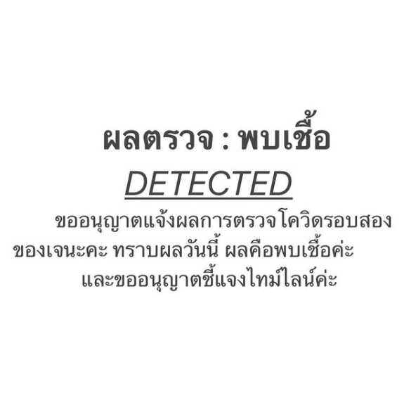 โดยล่าสุด เจด้า ได้โพสต์ข้อความแจ้งอินสตาแกรมส่วนตัว ระบุว่า “ผลตรวจ : พบเชื้อ DETECTED ขออนุญาตแจ้งผลการตรวจ โควิดรอบสอง ของเจนะคะ ทราบผลวันนี้ ผลคือพบเชื้อค่ะ และขออนุญาตชี้แจงไทม์ไลน์ค่ะ”