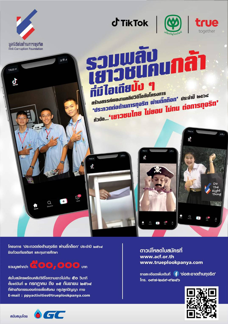 มูลนิธิต่อต้านการทุจริต เล็งเห็นถึงความสำคัญของเยาวชนที่จะเป็นพลังสำคัญของชาติ จึงได้จัดกิจกรรมที่ปลูกจิตสำนึกความมีจิตสาธารณะ และในการร่วมกันสร้างสังคมให้โปร่งใสไร้การทุจริต โดยร่วมกับ เครือเจริญโภคภัณฑ์ และ บริษัท ทรู คอร์ปอเรชั่น จำกัด (มหาชน) พร้อมด้วยติ๊กต็อก ในการสนับสนุนจาก บริษัท พีทีที โกลบอล เคมิคอล จำกัด (มหาชน) จัดโครงการ ประกวด”ต่อต้านการทุจริต ผ่านติ๊กต็อก” ประจำปี 2564