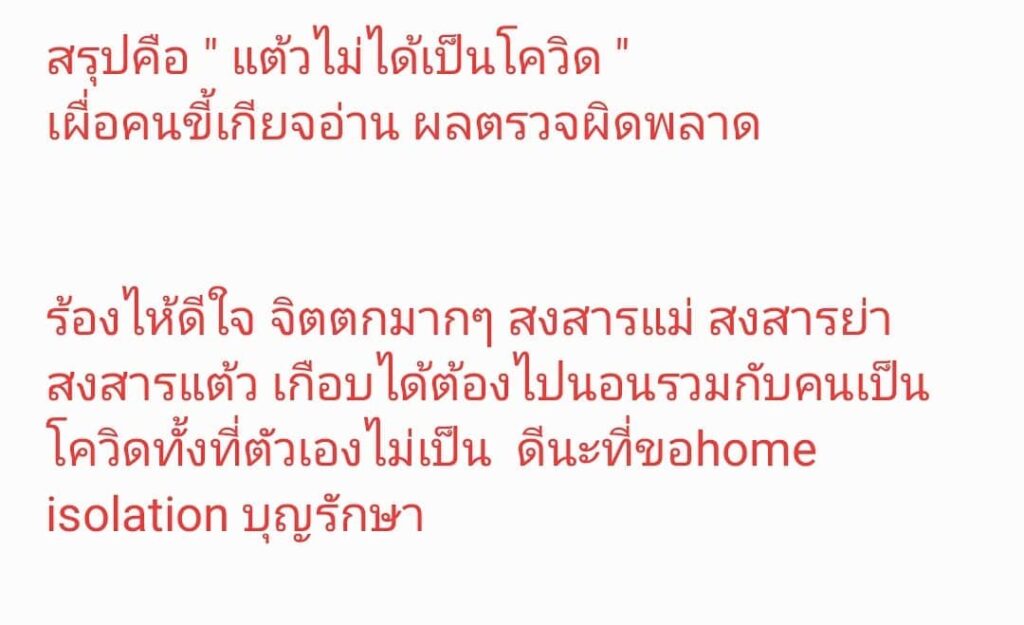 พร้อมกับเขียนบรรยาแคปชั่นไว้ว่า “คุณไม่เป็นเราคุณไม่เข้าใจหรอก น้องติดโควิด แถมโดนด่าเสียๆหายๆ ห่วงแม่ก็แก่แล้วจะติด ห่วงย่าที่ยังไม่ได้ฉีดวัคซีนที่แม่ไปหา ดีนะไม่ตัดสินใจไปนอนรพ.ทีนี้น้องได้เป็นจริงๆแน่นอน บุญรักษาที่คิดว่าอาการไม่หนัก ขอ home isolation เอาเตียงให้คนอื่นที่หนัก สรุปไม่ติด ต้องไปทำบุญใหญ่แล้วละ แก้ข่าวให้ด้วย น้องไม่ติด ใครด่าไว้มาขอโทษเลย”