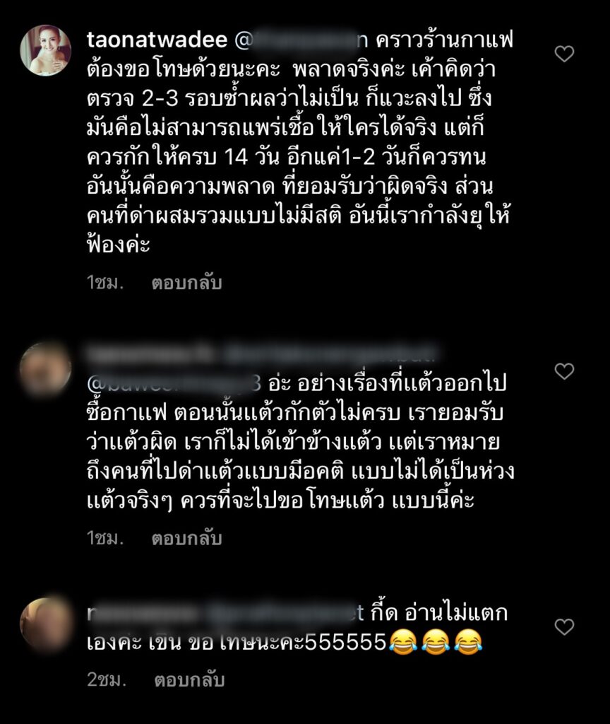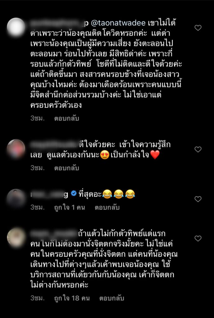 ซึ่งงานนี้ชาวเน็ตก้เข้ามาคอมเมนต์ตอกกลับว่าที่หลายคนด่า ไม่ได้เกี่ยวกับที่ดาราสาวติดโควิด แต่เป็นเรื่องของความรับผิดชอบต่อสังคมและเรื่องกักตัวทิพย์มากกว่า พร้อมทั้งยังอยากให้นึกถึงคนอื่นที่ได้รับผลกระทบจากเรื่องดังกล่าวด้วย และส่วนหนึ่งก็มีคนเข้ามาคอมเมนต์ให้กำลังใจสาวแต้วและครอบครัวด้วยเช่นกัน