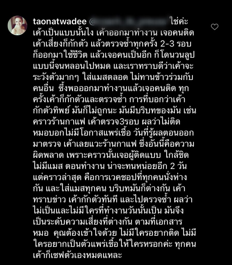 หลังจากก่อนหน้านี้ดาราสาวแต้ว ณฐพร แจ้งผลตรวจพบเชื้อโควิด -19 และแจ้งไทม์ไลน์อย่างละเอียด ก่อนที่จะมีการแก้ไขไทม์ไลน์ที่ตกหล่น และขอรับการรักษาตัวที่บ้าน เนื่องจากอาการไม่รุนแรง เพื่อเก็บสิทธิ์เตียงรักษาให้กับผู้ป่วยที่มีอาการหนัก ท่ามกลางกระแสวิพากษ์วิจารณ์จากชาวเน็ตถึงเรื่องการกักตัวทิพย์ และความรับผิดชอบต่อสังคมที่บกพร่อง เพราะมีคนเห็นสาวแต้วยังคงเดินทางออกไปใช้ชีวิตข้างนอก ทั้งที่ควรจะกักตัวอยู่ที่บ้าน