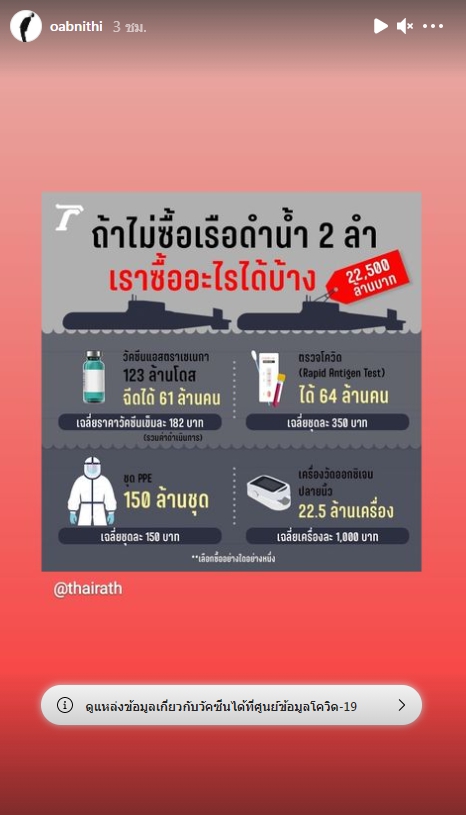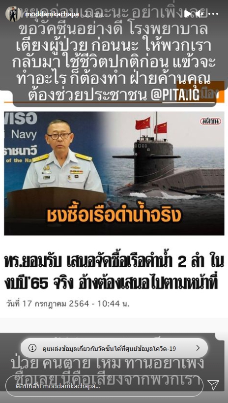 ขณะที่พิธีกรชื่อดัง มดดำ คชาภา ก็ออกมาเคลื่อนไหวเช่นกันพร้อมทั้งโพสต์ภาพและข้อความบนอินสตาแกรมสตอรี่ระบุว่า “ถ้ายังไม่ต้องซื้อ เรือดำน้ำ เราจะมีวัคซีนฉีด คนละ 3.3 เข็มทั้งประเทศทุกคนในประเทศไทยกราบเรียนถามท่านเถอะ ว่าวันนี้คนติดหลักหมื่น คนตายหลักร้อย ท่านยังจะซื้อเรือดำนำไปทำไม”