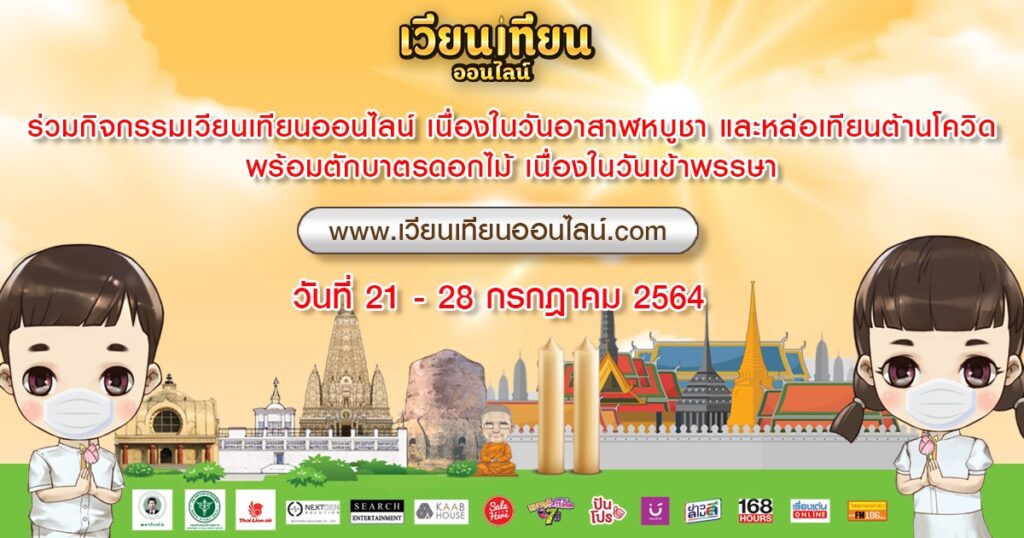 กรมสนับสนุนบริการสุขภาพ กระทรวงสาธารณสุข, สายการบินไทยไลอ้อนเเอร์, ฟ้าทะลายโจรตราใบห่อ ร่วมกับ NextGen Solution, KAAB House (ค๊าปเฮาท์) กลุ่มบริษัทเซิร์ชฯ โดยมีพระมหา ดร.ณัฐพงษ์ นาคถ้ำ เป็นที่ปรึกษาฝ่ายสงฆ์ ขอเชิญชวนพุทธศาสนิกชนร่วมเวียนเทียนออนไลน์ เนื่องในวันอาสาฬหบูชา และหล่อเทียน ถวายผ้าอาบน้ำฝน ตักบาตรดอกไม้ เนื่องในวันเข้าพรรษา ในโครงการสัปดาห์พุทธศาสนา ภายใต้คอนเซปต์ “เวียนเทียนออนไลน์ ร่วมใจหล่อเทียนต้านโควิด เพิ่มบุญชีวิต ร่วมกันถวายทาน” ระหว่างวันที่ 21 – 28 กรกฎาคม 2564 นี้ ที่เว็บไซต์ www.เวียนเทียนออนไลน์.com