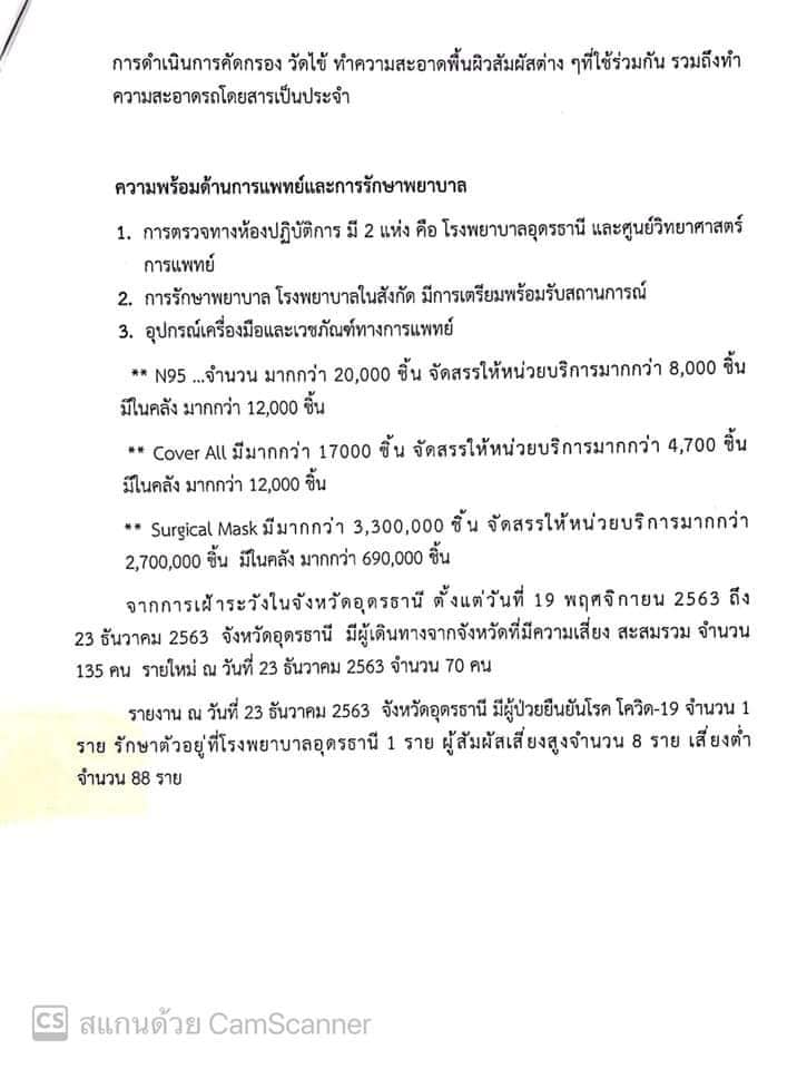 ผู้สื่อข่าวรายงานว่า วานนี้(23 ธ.ค.) นายสยาม ศิริมงคล ผู้ว่าราชการจังหวัดอุดรธานี พร้อมด้วย ดร.นายแพทย์ ปรเมษฐ์ กิ่งโก้ นายแพทย์สาธารณสุขจังหวัดอุดรธานี และ พล.ต.ต.พิษณุ อุณหเสรี ผู้บังคับการตำรวจภูธรจังหวัดอุดรธานี ร่วมกันแถลงข่าว จังหวัดอุดรธานี พบผู้ติดเชื้อโควิด19 รายแรก ในระลอก 2 โดยเป็นชายไทย อายุ 30 ปี มีอาชีพขายอาหารทะเล ที่ตลาดสดเทศบาลโนนสูง ต.โนนสูง อ.เมือง จ.อุดรธานี ซึ่งรายงานยืนยันผลการตรวจเชื้อไวรัสโคโรน่า 2019 เป็นชายชาวจังหวัดอุดรธานีอายุ 30 ปี มีการสัมผัสมาจากจังหวัดสมุทรสาคร เมื่อเวลาประมาณ 11 โมง ส่วนสาเหตุที่ไม่ได้แถลงข่าวทันที เนื่องจากมีความจำเป็นในการเตรียมความพร้อมในเรื่องประกาศ การกำหนดมาตรการระยะสั้น และระยะยาว นอกได้ลงพื้นที่ไปพร้อมกับตำรวจและสาธารณสุข มีผู้เกี่ยวข้องจำนวนมาก เนื่องจากผู้ติดเชื้อทำกิจกรรมที่บริเวณตลาด มีผู้ที่เกี่ยวข้องใกล้ชิดมากใกล้ชิดน้อย ความเสี่ยงสูง ความเสี่ยงต่ำ จำนวนมากกว่า 500 คน ที่ขณะนี้กำลังดำเนินการตรวจคัดกรองอยู่ จากเหตุการณ์ดังกล่าว จังหวัดอุดรธานี ได้ดำเนินการ คือ 1.ปิดตลาดเทศบาลโนนสูง และบริษัท ห้องเย็นมหาชัยวาริน 1 จำกัด สาขาอุดรธานี ต.หนองบัว อ.เมือง จ.อุดรธานี เป็นเวลา 3 วัน คือ ระหว่างวันที่ 23-25 ธันวาคม 2563 และล้างตลาดเพื่อฆ่าเชื้อ 2.ประชาสัมพันธ์ให้ประชาชนที่เดินทางมาจาก จังหวัดสมุทรสาคร ที่เข้ามาพื้นที่จังหวัดอุดรธานี ให้รายงานตัว เพื่อเฝ้าระวังสังเกตอาการตนเองเป็นเวลา 14 วัน แนะนำให้สวมหน้ากาอนามัย หรือ หน้ากากผ้าตลอดเวลา หลีกเลี่ยงการคลุกคลีใกล้ชิดกับผู้อื่น ไม่ควรไปในที่ชุมชน หากเริ่มมีอาการป่วยทางเดินหายใจ ให้รีบไปรับการตรวจรักษาที่โรงพยาบาลใกล้บ้าน โดยหลีกเลี่ยงการเดินทางด้วยรถสาธารณะ และขอให้สวนหน้ากากอนามัยขณะเดินทาง, สำรวจประชาชน, พ่อค้า แม่ค้า ขายอาหารทะเล, รถส่งของที่เคยไปติดต่อค้าขายที่ตลาดกลางกุ้ง และที่พักบริเวณรอบๆ ตลาดกลางกุ้ง จังหวัดสมุทรสาคร โดยตรง ตั้งแต่วันที่ 1 ธันวาคม เป็นต้นมา ไทม์ไลน์ผู้ติดเชื้อรายแรก ในระลอกที่ 2 ของจังหวัดอุดรธานี วันที่ 8-9 ธันวาคม อยู่บ้านโนนสูง อ.เมือง จ.อุดรธานี เดินทางไปส่งภรรยาที่ตลาดสดโนนสูง ไม่ได้เดินทางไปที่อื่น วันที่ 10 ธันวาคม ตั้งแต่เวลา 10.00 น. เดินทางไปที่ตลาดทะเลไทย จ.สมุทรสาคร โดยรถยนต์ส่วนตัวกับภรรยาย มีแรงงานพม่าช่วยขนของขึ้นรถ 1 คน ใส่แมสก์แบบใส่ๆ ถอดๆ ต่อมา เวลา 01.00-12.00 น. วันที่ 11 ธันวาคม เดินทางกลับอุดรธานีด้วยรถยนต์ส่วนตัว ไม่ได้ลงจากรถ วันที่ 17 ธันวาคม ไปส่งภรรยาร้านเสริมสว
