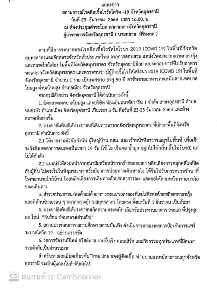 ผู้สื่อข่าวรายงานว่า วานนี้(23 ธ.ค.) นายสยาม ศิริมงคล ผู้ว่าราชการจังหวัดอุดรธานี พร้อมด้วย ดร.นายแพทย์ ปรเมษฐ์ กิ่งโก้ นายแพทย์สาธารณสุขจังหวัดอุดรธานี และ พล.ต.ต.พิษณุ อุณหเสรี ผู้บังคับการตำรวจภูธรจังหวัดอุดรธานี ร่วมกันแถลงข่าว จังหวัดอุดรธานี พบผู้ติดเชื้อโควิด19 รายแรก ในระลอก 2 โดยเป็นชายไทย อายุ 30 ปี มีอาชีพขายอาหารทะเล ที่ตลาดสดเทศบาลโนนสูง ต.โนนสูง อ.เมือง จ.อุดรธานี ซึ่งรายงานยืนยันผลการตรวจเชื้อไวรัสโคโรน่า 2019 เป็นชายชาวจังหวัดอุดรธานีอายุ 30 ปี มีการสัมผัสมาจากจังหวัดสมุทรสาคร เมื่อเวลาประมาณ 11 โมง ส่วนสาเหตุที่ไม่ได้แถลงข่าวทันที เนื่องจากมีความจำเป็นในการเตรียมความพร้อมในเรื่องประกาศ การกำหนดมาตรการระยะสั้น และระยะยาว นอกได้ลงพื้นที่ไปพร้อมกับตำรวจและสาธารณสุข มีผู้เกี่ยวข้องจำนวนมาก เนื่องจากผู้ติดเชื้อทำกิจกรรมที่บริเวณตลาด มีผู้ที่เกี่ยวข้องใกล้ชิดมากใกล้ชิดน้อย ความเสี่ยงสูง ความเสี่ยงต่ำ จำนวนมากกว่า 500 คน ที่ขณะนี้กำลังดำเนินการตรวจคัดกรองอยู่ จากเหตุการณ์ดังกล่าว จังหวัดอุดรธานี ได้ดำเนินการ คือ 1.ปิดตลาดเทศบาลโนนสูง และบริษัท ห้องเย็นมหาชัยวาริน 1 จำกัด สาขาอุดรธานี ต.หนองบัว อ.เมือง จ.อุดรธานี เป็นเวลา 3 วัน คือ ระหว่างวันที่ 23-25 ธันวาคม 2563 และล้างตลาดเพื่อฆ่าเชื้อ 2.ประชาสัมพันธ์ให้ประชาชนที่เดินทางมาจาก จังหวัดสมุทรสาคร ที่เข้ามาพื้นที่จังหวัดอุดรธานี ให้รายงานตัว เพื่อเฝ้าระวังสังเกตอาการตนเองเป็นเวลา 14 วัน แนะนำให้สวมหน้ากาอนามัย หรือ หน้ากากผ้าตลอดเวลา หลีกเลี่ยงการคลุกคลีใกล้ชิดกับผู้อื่น ไม่ควรไปในที่ชุมชน หากเริ่มมีอาการป่วยทางเดินหายใจ ให้รีบไปรับการตรวจรักษาที่โรงพยาบาลใกล้บ้าน โดยหลีกเลี่ยงการเดินทางด้วยรถสาธารณะ และขอให้สวนหน้ากากอนามัยขณะเดินทาง, สำรวจประชาชน, พ่อค้า แม่ค้า ขายอาหารทะเล, รถส่งของที่เคยไปติดต่อค้าขายที่ตลาดกลางกุ้ง และที่พักบริเวณรอบๆ ตลาดกลางกุ้ง จังหวัดสมุทรสาคร โดยตรง ตั้งแต่วันที่ 1 ธันวาคม เป็นต้นมา ไทม์ไลน์ผู้ติดเชื้อรายแรก ในระลอกที่ 2 ของจังหวัดอุดรธานี วันที่ 8-9 ธันวาคม อยู่บ้านโนนสูง อ.เมือง จ.อุดรธานี เดินทางไปส่งภรรยาที่ตลาดสดโนนสูง ไม่ได้เดินทางไปที่อื่น วันที่ 10 ธันวาคม ตั้งแต่เวลา 10.00 น. เดินทางไปที่ตลาดทะเลไทย จ.สมุทรสาคร โดยรถยนต์ส่วนตัวกับภรรยาย มีแรงงานพม่าช่วยขนของขึ้นรถ 1 คน ใส่แมสก์แบบใส่ๆ ถอดๆ ต่อมา เวลา 01.00-12.00 น. วันที่ 11 ธันวาคม เดินทางกลับอุดรธานีด้วยรถยนต์ส่วนตัว ไม่ได้ลงจากรถ วันที่ 17 ธันวาคม ไปส่งภรรยาร้านเสริมสว