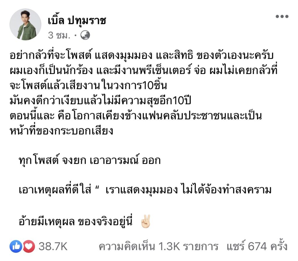 “อย่ากลัวที่จะโพสต์ แสดงมุมมอง และสิทธิ ของตัวเองนะครับ ผมเองก็เป็นนักร้อง และมีงานพรีเซ็นเตอร์ จ่อ ผมไม่เคยกลัวที่จะโพสต์แล้วเสียงานในวงการ10ชิ้น มันคงดีกว่าเงียบแล้วไม่มีความสุขอีก10ปี ตอนนี้และ คือโอกาสเคียงข้างแฟนคลับประชาชนและเป็นหน้าที่ของกระบอกเสียง ทุกโพสต์ จงยก เอาอารมณ์ ออก เอาเหตุผลที่ดีใส่ “ เราแสดงมุมมอง ไม่ได้จ้องทำสงคราม อ้ายมีเหตุผล ของจริงอยู่นี่ ✌🏻”
