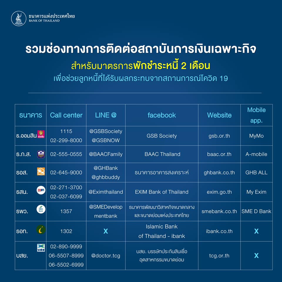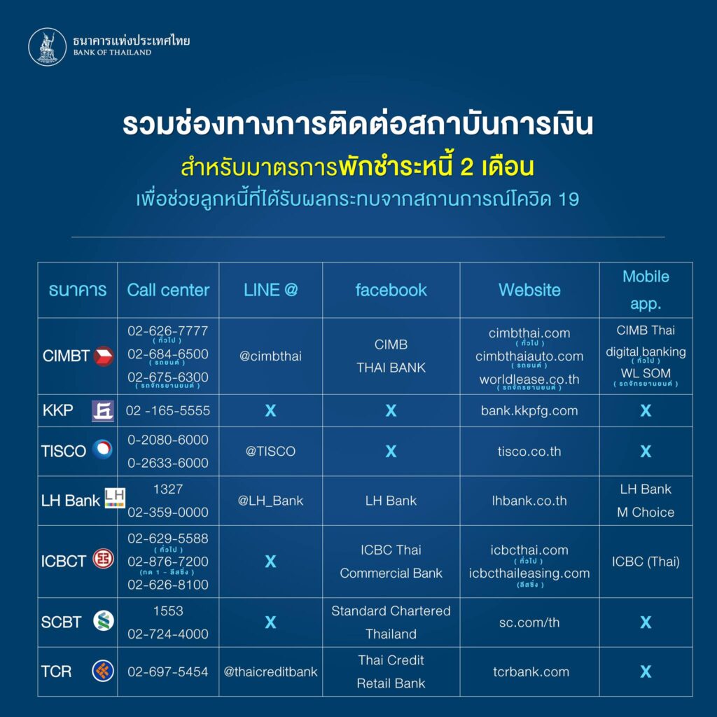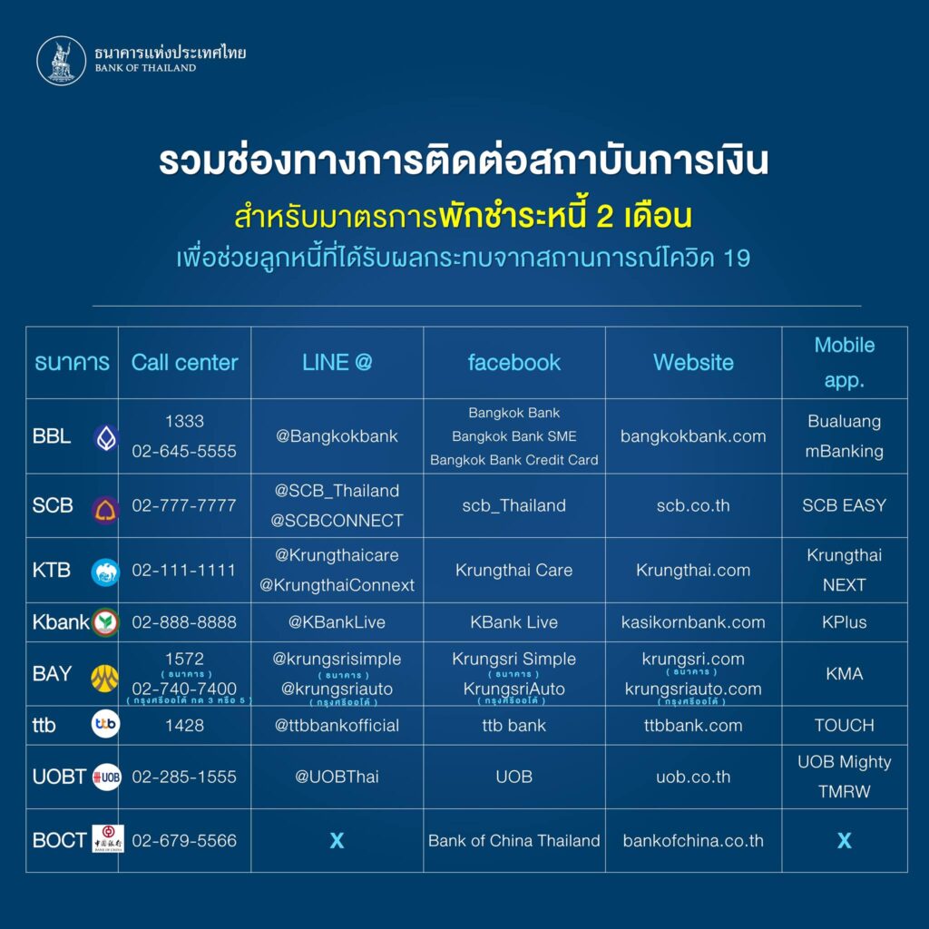 ช่องทางติดต่อสถาบันการเงิน ธนาคาร สำหรับพักชำระหนี้