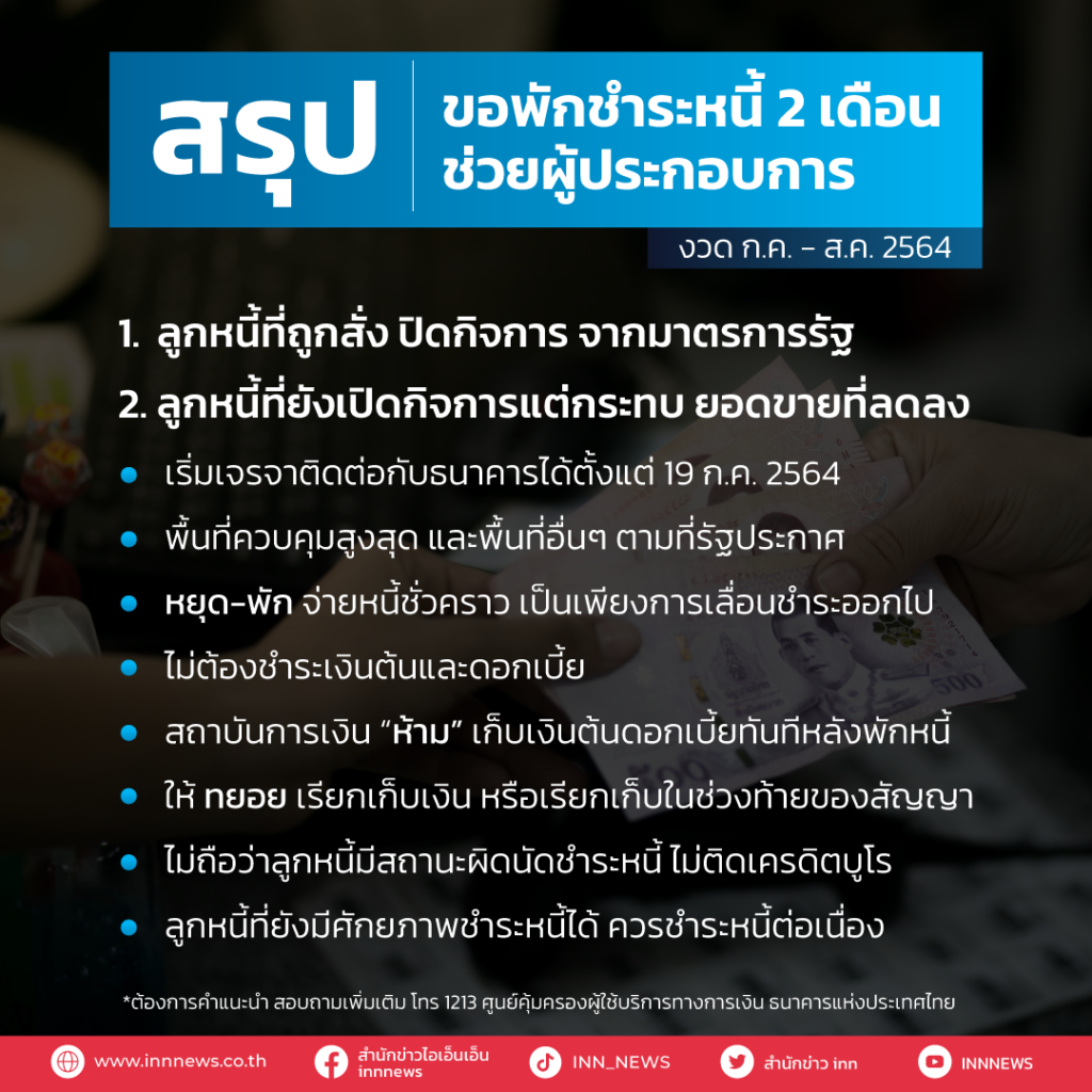 - พักชำระเงินต้นและดอกเบี้ย ตั้งแต่เดือนกรกฎาคม ถึงเดือนสิงหาคม 2564