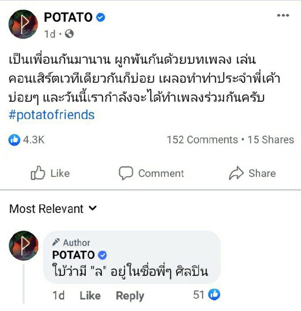 เป็นอันรู้กันว่าเพจ POTATO เค้าคึกคักตลอดๆ ไม่ว่าจะเคลื่อนไหวอะไร แฟนๆก็แห่ตามไปคอมเม้นต์กันไม่หยุดไม่หย่อน ล่าสุดหลังจากที่เพจวงได้โพสต์สเตตัสเปรยว่า “เป็นเพื่อนกันมานาน ผูกพันกันด้วยบทเพลง เล่นคอนเสิร์ตเวทีเดียวกันก็บ่อย เผลอทำท่าประจำพี่เค้าบ่อยๆ และวันนี้เรากำลังจะได้ทำเพลงร่วมกันครับ ” ทำเอาแฟนเพลงกระหน่ำคอมเม้นต์ถล่มทลาย แถมเดากันไปต่างๆนาๆ ว่าศิลปินที่มาร่วมงานจะเป็นใครน้า? แต่ที่แน่ๆ แอดมินใจดีแอบเพิ่มคำใบ้มาให้ตั้ง 1 ตัว ว่ามีอักษร “ล” อยู่ในชื่อ ! แอร๊ย…เปรยมาขนาดนี้ FC พร้อมเคลียร์หูรอฟังเพลงใหม่ได้เลย รับรองว่าเซอร์ไพรส์แน่….เฮ้!