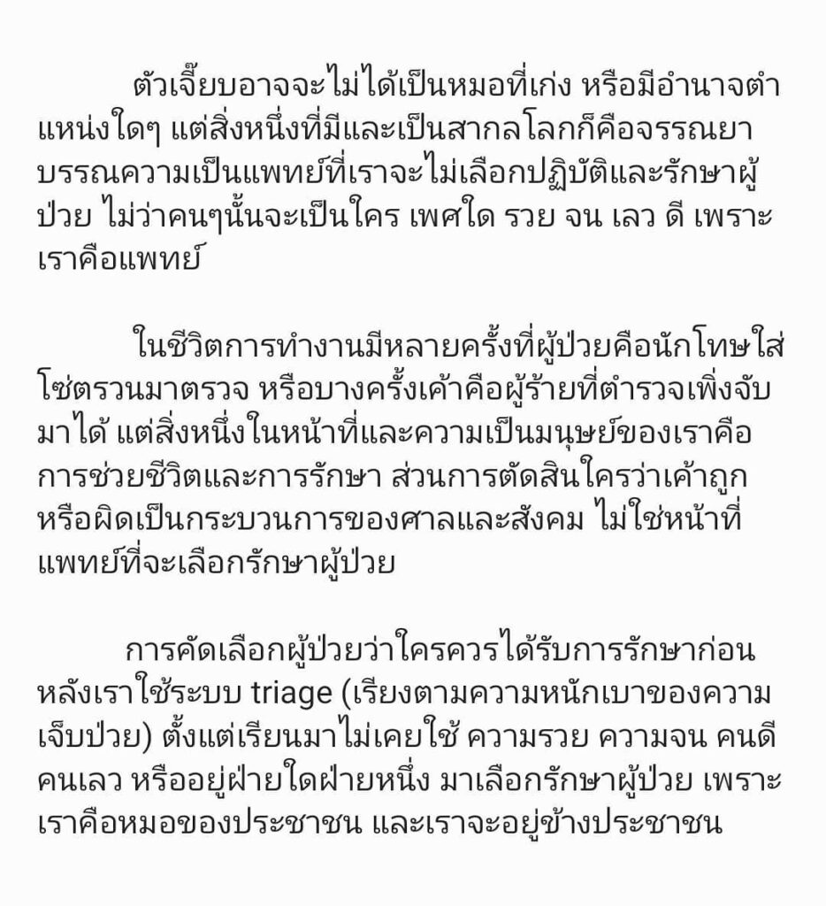 “ตัวเจี๊ยบอาจจะไม่ได้เป็นหมอที่เก่ง หรือมีอำนาจตำแหน่งใดๆ แต่สิ่งหนึ่งที่มี และเป็นสากลโลกก็คือ จรรยาบรรณความเป็นแพทย์ ที่เราจะไม่เลือกปฏิบัติ และรักษาผู้ป่วย ไม่ว่าคนๆนั้นจะเป็นใคร เพศใด รวย จน เลว ดี เพราะ ในชีวิตการทำงานมีหลายครั้งที่ผู้ป่วย คือนักโทษใส่โซ่ตรวนมาตรวจ หรือบางครั้งเค้าคือผู้ร้ายที่ตำรวจเพิ่งจับมาได้ แต่สิ่งหนึ่งในหน้าที่ และความเป็นมนุษย์ของเราคือการช่วยชีวิตและการรักษา ส่วนการตัดสินใครว่าเค้าถูก หรือผิด เป็นกระบวนการของศาล และสังคม ไม่ใช่หน้าที่แพทย์ที่จะเลือกรักษาผู้ป่วย การคัดเลือกผู้ป่วยว่าใครควรได้รับการรักษาก่อน หลังเราใช้ระบบ triage (เรียงตามความหนักเบาของความเจ็บป่วย) ตั้งแต่เรียนมาไม่เคยใช้ ความรวย ความจน คนดี คนเลว หรืออยู่ฝ่ายใดฝ่ายหนึ่ง มาเลือกรักษาผู้ป่วย เพราะ เราคือหมอของประชาชน และเราจะอยู่ข้างประชาชน”