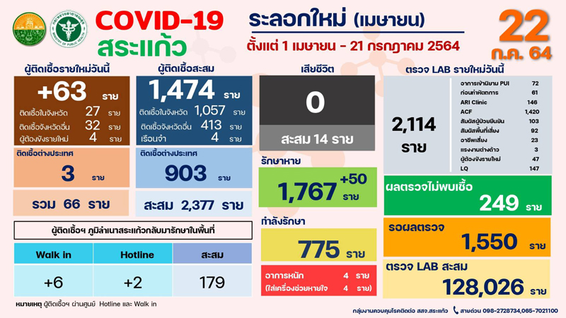 สำหรับจังหวัดสระแก้วพบผู้ป่วยยืนยันรายใหม่ 63 ราย (ติดเชื้อในจังหวัด 27 ราย จากจังหวัดอื่น 32 ราย ในเรื่อนจำ 4ราย) ผู้ติดเชื้อจากต่างประเทศ 3 ราย รวมทั้งสิ้น 66 ราย เฉพาะติดเชื้อในพื้นที่ 27 ราย ที่อำเภออรัญประเทศ 16 ราย อำเภอวัฒนานคร 4 ราย อำเภอโคกสูง 3 ราย อำเภอคลองหาด 2 ราย และอำเภอเมืองสระแก้ว 2 ราย