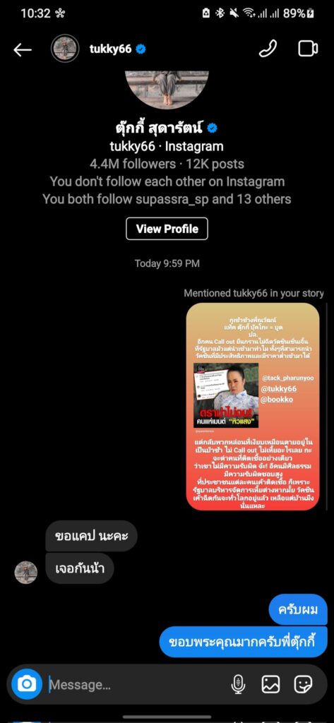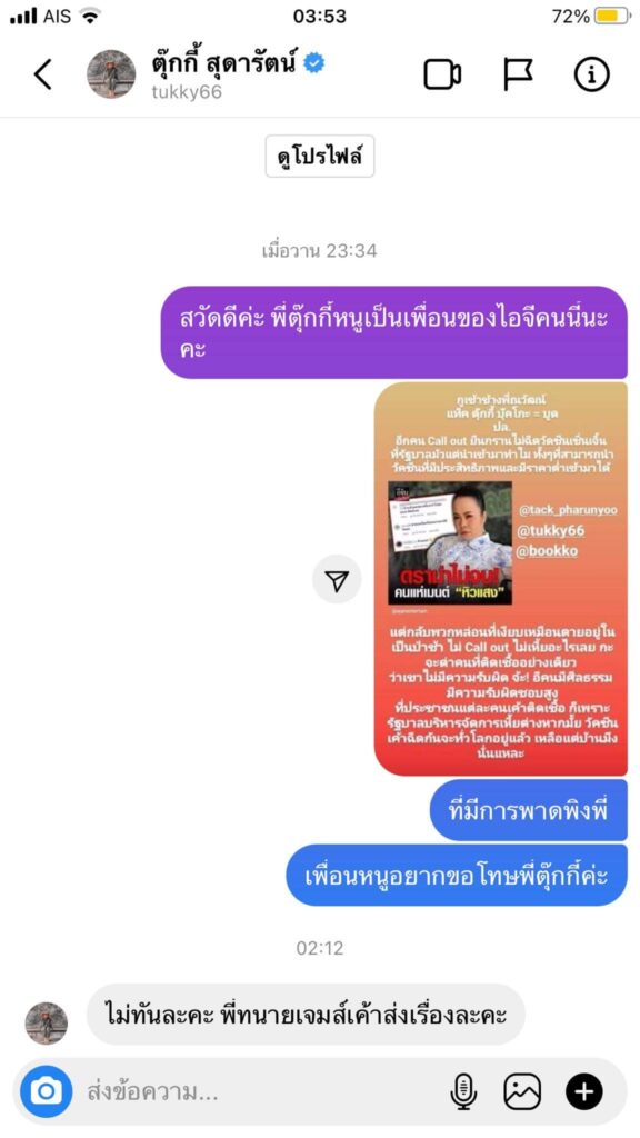 ต่อมามีเพื่อนของคู่กรณี ได้ส่งข้อความไปขอโทษ บอกว่า “สวัสดีค่ะ พี่ตุ๊กกี้หนูเป็นเพื่อนของไอจีคนนี้นะคะ ที่มีการพาดพิงพี่ เพื่อนหนูอยากขอโทษพี่ตุ๊กกี้ค่ะ ด้าน“ตุ๊กกี้” ตอบกลับว่า “ไม่ทันละคะ พี่ทนายเจมส์เขาส่งเรื่องละคะ”