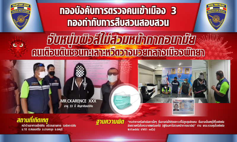 ในเวลาต่อมาชุดจับกุมได้ทำการสืบสวนจนทราบว่าชายผิวสีคนดังกล่าวคือนายแคเรน(ขอสงวนนามสกุล) อายุ 33 ปี สัญชาติ อเมริกัน พักอาศัยอยู่คอนโดมิเนียมย่านเขาพระตำหนัก จึงได้เข้าไปสืบหาตัวจนพบ นายแคเรน เดินอยู่ใกล้บริเวณดังกล่าวจึงได้เข้าไปขอตรวจสอบก็พบว่าเป็นคนเดียวกัน จึงได้เชิญตัวมายังสภ.เมืองพัทยา เพื่อทำการแจ้งข้อกล่าวหาและเปรียบเทียบปรับในความผิดที่เกิดขึ้น ฐานกระทำการใดๆ ซึ่งอาจก่อให้เกิดสภาวะที่ไม่ถูกสุขลักษณะ ซึ่งอาจเป็นเหตุให้โรคติดต่ออันตรายหรือโรคระบาดแพร่ออกไป(ไม่สวมหน้ากากอนามัย) เป็นความผิดตาม พ.ร.บ.ควบคุมโรคติดต่อฯ