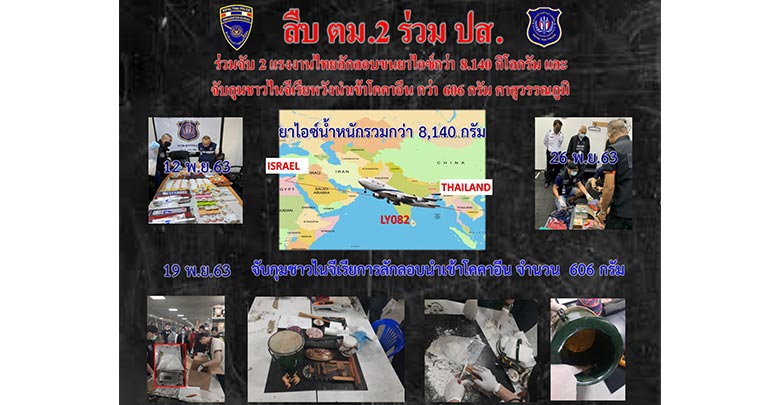 พล.ต.ท.สมพงษ์ ชิงดวง ผู้บัญชาการสำนักงานตรวจคนเข้าเมือง ร่วมกับตำรวจ ตม.2ร่วมกับตำรวจปราบปรามยาเสพติด จับกุม นายเต่ง ชาวจังหวัดเชียงราย ขณะเตรียมลักลอบนำไอซ์ที่ซุกซ่อนบรรจุในซองเกลือแร่ ใส่ในกระเป๋าเดินทางน้ำหนักกว่า 4 กิโลกรัม จากนั้นได้ขยายผลไปจับกุม นายคาย ชาวจังหวัดเชียงรายเช่นกัน ขณะเตรียมนำไอซ์ซุกซ่อนในก้อนสบู่ เเละซองชา น้ำหนักกว่า 4 กิโลกรัม ซุกซ่อนในกระเป๋าเดินทาง โดยผู้ต้องหาทั้ง 2 ราย เตรียมจะเดินทางไปยังประเทศอิสราเอล ผ่านท่าอากาศยานนานาชาติสุวรรณภูมิ โดยทำทีเป็นเเรงงานจะไปทำงานที่ประเทศอิสราเอล เเต่มีเบื้องหลังรับจ้างขนไอซ์ออกนอกประเทศร่วมไปด้วย โดยได้ค่าจ้างคนละ 2 ล้านบาท อีกคดีจับกุมชายชาวไนจีเรีย พร้อมโคคาอีน หรือ โคเคน ขณะชายคนดังกล่าวมาแสดงตัวขอรับพัสดุที่บริษัทแห่งหนึ่ง ตำรวจจึงแสดงตัวขอตรวจค้นพบโคคาอีนที่ซุกซ่อนอยู่ในโครงขอบด้านล่างของกล่อง ก่อนคุมตัวส่งพนักงานสอบสวนกองบัญชาการปราบปรามยาเสพติดดำเนินคดี