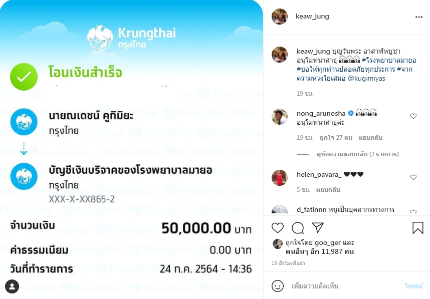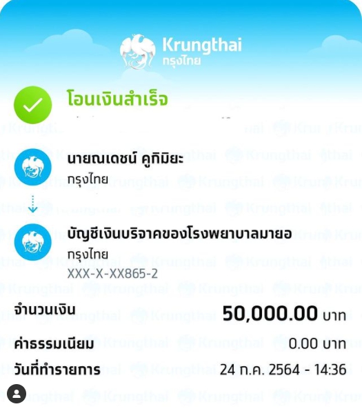 ล่าสุดแม่แก้วได้โพสต์ภาพบัญชีชื่อ ณเดชน์ ได้โอนเงินเป็นจำนวนเงิน 50,000 บาท ให้กับโรงพยาบาลยะลา เพื่อสมทบทุนอุปกรณ์ทางการแพทย์ผ่านอินสตาแกรมส่วนตัว