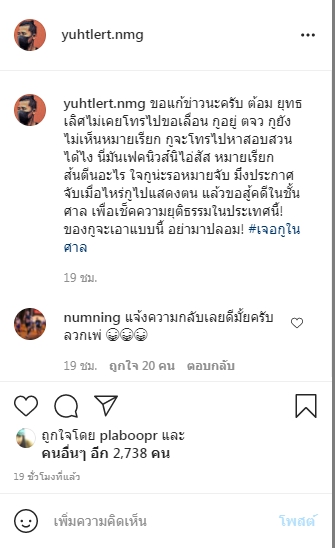 ล่าสุดทางด้าน ต้อม ยุทธเลิศผู้กำกับหนังชื่อดัง ได้เคลื่อนไหวผ่านอินสตาแกรมส่วนตัว ด้วยการโพสต์ภาพข่าวที่อ้างว่าตนขอเลื่อนเข้าพบตำรวจ พร้อมเขียนข้อความ ระบุว่า