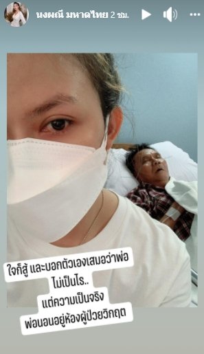 “คุณหมอสันนิษฐานว่าคุณพ่อจะเป็นเยื้อหุ้มสมองอักเสบ ต้องรอผลตรวจ แต่ตอนนี้พ้นขีดอันตรายแล้ว ขอบคุณคุณหมอ และบุคลากร รพ.แสวงหา, รพ.หมอเจิด สิงห์บุรี และ รพ.พญาไท1 มากๆนะคะ ขอบคุณจากใจนะคะ”