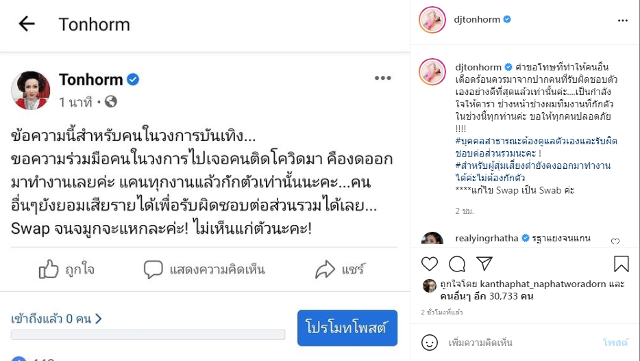 โดย ขอความระบุว่า”ข้อความนี้สำหรับคนในวงการบันเทิง… ขอความร่วมมือคนในวงการไปเจอเจอคนติดโควิด มา คืองดออกมาทำงานเลยค่ะ แคนทุกงานแล้วกักตัวเท่านั้นนะคะ… คนอื่นๆยังยอมเสียรายได้เพื่อรับผิดชอบต่อส่วนรวมได้เลย… Swap จนจมูกจะแหกละค่ะ! ไม่เห็นแก่ตัวนะคะ!”