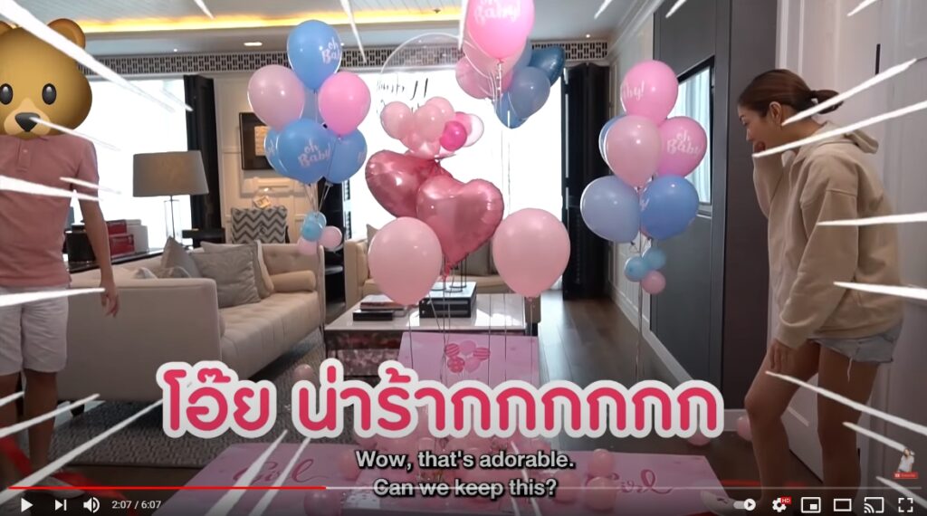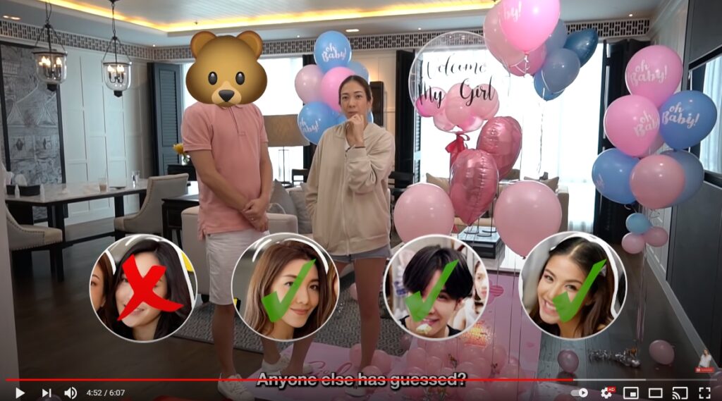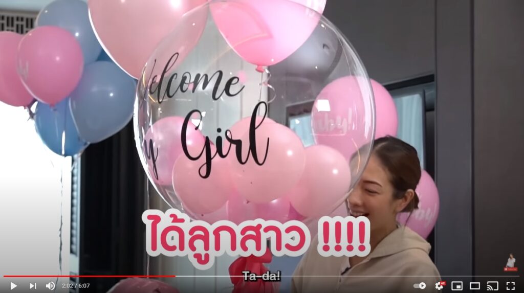 โดยในคลิป แป้งและคุณสามีที่มีอิโมจิหมีปิดหน้าไว้ ร่วมเฉลยเพศลูก พร้อมช่วยกันดึงโบว์ที่ผูกติดไว้กับกล่องใบใหญ่เอาไว้ ก่อนจะมีลูกโป่งลอยขึ้นมาเป็นสีชมพูสุดน่ารัก ระบุข้อความว่า My Gilr ได้ลูกสาว ทำให้คุณแม่แป้งยิ้มแก้มปริเลยทีเดียว ซึ่งแป้งได้สัมภาษณ์สามีถึงความรู้สึกที่ได้ลูกสาว เจ้าตัวก็ตอบว่า “ตื่นเต้นสุดๆ ชีวิตใหม่กำลังจะเกิดขึ้น ผมดีใจสุดๆ” นอกจากนี้สาวแป้งยังทิ้งท้ายอีกว่า “ถ้าใครอยากเห็นว่าคุณสามีหน้าตาเป็นอย่างไร ก็ต้องคอยติดตามเรื่อยๆ นะคะ”