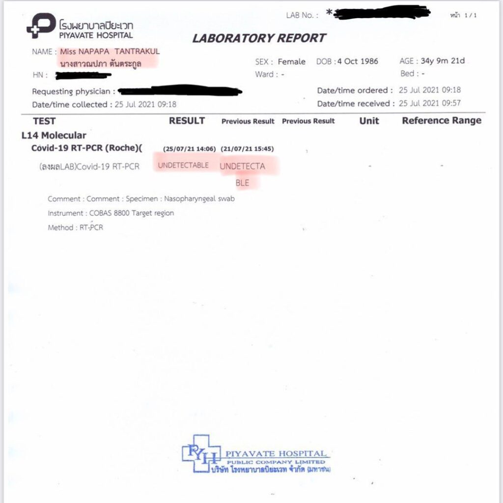 ล่าสุดสาวแพทได้ออกมาโพสต์อินสตาแกรมส่วนตัว โชว์ผลตรวจจากโรงพยาบาลปิยะเวทผลออกมาว่าเป็นลบ ไม่ติดเชื้อโควิด-19 แน่นอนแล้ว ทำให้เจ้าตัวรู้สึกโล่ง พร้อมกลับไปทำงานอย่างสบายใจ งานนี้ก็มีเพื่อนๆในวงการและแฟนคลับเข้ามาแสดงความยินดีกับสาวแพทเป็นจำนวนมาก