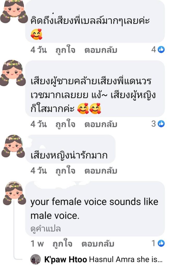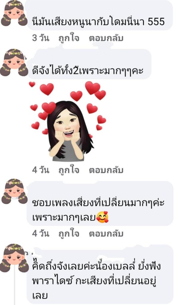 บางคนบอกว่าเสียงเหมือน ดัง พันกร, แดน วรเวช, เสียงผู้หญิงเหมือนไบรโอนี่ มาก ร้อง 2 เสียงเหมือน หนูนากับโดม เดอะสตาร์ โดยรวมมีแต่คนชมว่าเพราะมาก งานนี้เราเลยขอสัมภาษณ์จากอเมริกาว่าเบลล์รู้สึกกับคลิปนี้ยังไงบ้าง เมื่อมีคนไทยคิดถึงเสียงร้องเพลงเพราะๆ ของเบลล์มากมาย “เบลล์ต้องบอกก่อนว่าคลิปนี้ที่เบลล์กลับมาร้องเพลง 2 เสียงลงเพจอีกครั้งนึง เพราะว่าแฟนๆ หลายคนถามมาว่าพี่เบลล์จะกลับมาร้องเพลงอีกมั๊ยคิดถึงเสียง เบลล์ก็เลยได้กลับมาร้องเพลงและทำคลิป 2 เสียง Cover นี้ลงในเพจค่ะ เบลล์ดีใจที่แฟนเพลงกลับมาชมกันอีกครั้ง และที่ไม่อยากเชื่อเลยทุกคนยังอยู่ แฟนคลับที่เคยติดตามเราจาก Thailand God Talent เมื่อสิบปีที่แล้วยังอยู่ ก็ดีใจที่น้องๆ แฟนคลับยังติดตามเบลล์มาจนถึงทุกวันนี้ อยากจะขอบคุณทุกคนที่เข้ามาชม เข้ามาคอมเม้นท์ เข้ามากดไลค์ด้วยนะคะ อย่างไรเบลล์ก็ฝากให้ติดตามผลงงานเพลงใหม่ของเบลล์ด้วยนะคะ”