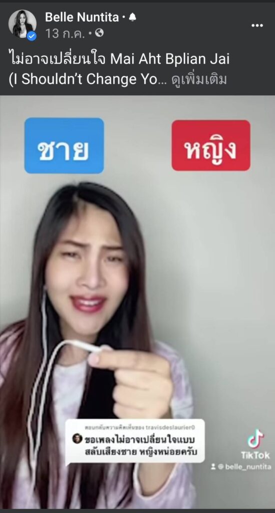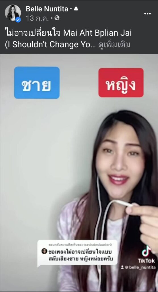 เป็นนักร้องคุณภาพเสียงทรงพลัง และเป็นที่จดจำได้ดีจากเวที Thailand God Talent “เบลล์–นันทิตา ฆัมภิรานนท์” เจ้าของฉายา เบลล์ 2 เสียง ล่าสุดได้มาเล่น TIKTOK ร้องเพลง ไม่อาจเปลี่ยนใจ ของ “เจมส์ เรืองศักดิ์” ซึ่งเบลล์ร้องเสียงหญิงชายสลับกันได้เพราะมากจนแฟนเพลงบ่นคิดถึงไปตามๆ กัน