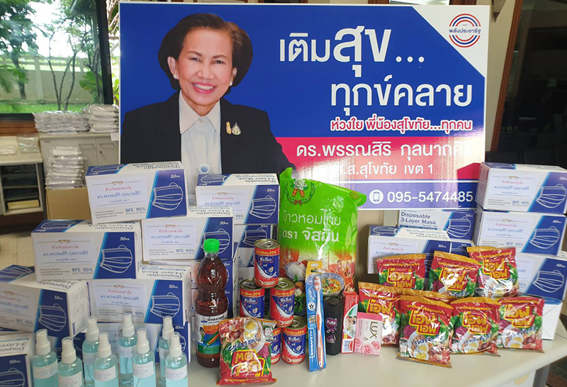 ศูนย์ประสานงานสถานการณ์ฉุกเฉิน พรรคพลังประชารัฐ หรือ ศปฉ.พปชร. โดย ร.อ.ธรรมนัส พรหมเผ่า รัฐมนตรีช่วยว่าการกระทรวงเกษตรและสหกรณ์ และเลขาธิการพรรคพลังประชารัฐ ในฐานะผู้อำนวยการ ศปฉ.พปชร. ได้มอบให้นางสาวพรรณสิริ กุลนาถศิริ ส.ส.สุโขทัย เขต 1 นำถุงยังชีพ จำนวน 1,000 ชุด ที่รับการสนับสนุนจากห้างร้านและภาคเอกชน มอบให้กับประชาชนที่ได้รับความเดือดร้อนจากการแพร่ระบาดของโควิด-19 ที่พื้นที่ อ.เมืองสุโขทัย อ.ศรีสำโรง อ.กงไกรลาศ ครอบคลุมพื้นที่ทั้งหมด 26 ตำบล โดยมีทีมงาน ส.ส., ส่วนราชการ, ผู้นำท้องที่, ผู้นำท้องถิ่น, อาสาสมัครสาธารณสุขประจำหมู่บ้าน หรือ อสม. และเครือข่าย รับมอบถุงยังชีพเพื่อนำไปแจกจ่ายให้กับประชาชน