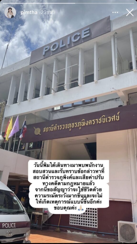 “วันนี้พิมได้เดินทางมาพบพนักงานสอบสวนและรับทราบข้อกล่าวหาที่สถานีตำรวจภูพิงค์และเสียค่าปรับทางคดีตามกฎหมายแล้ว จากนี้ขอสัญญาว่าขะใช้ชีวิตด้วยความระมัดระวังมากขึ้นและจะไม่ให้เกิดเหตุการณ์แบบนี้ขึ้นอีกค่ะ ขอบคุณค่ะ”
