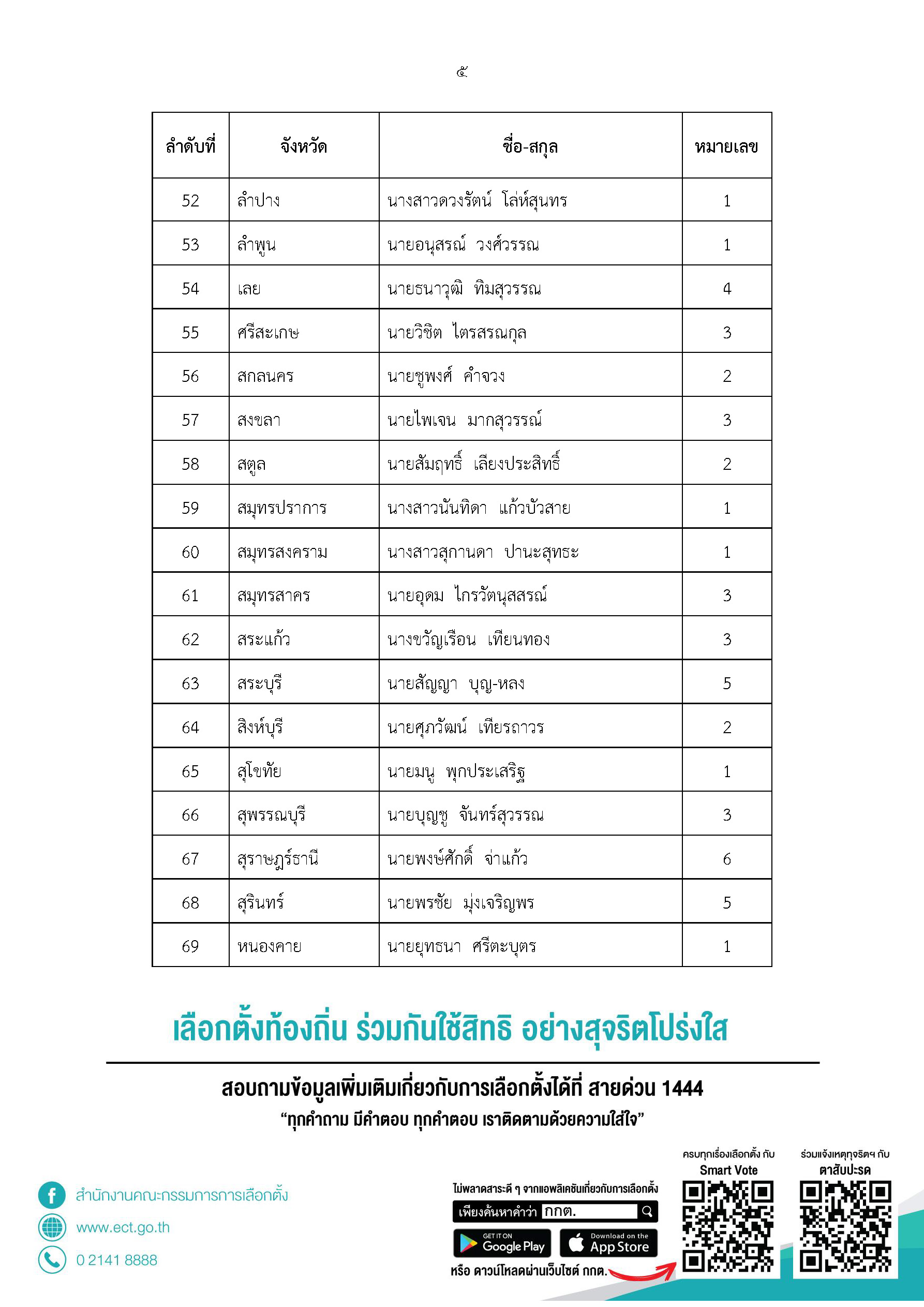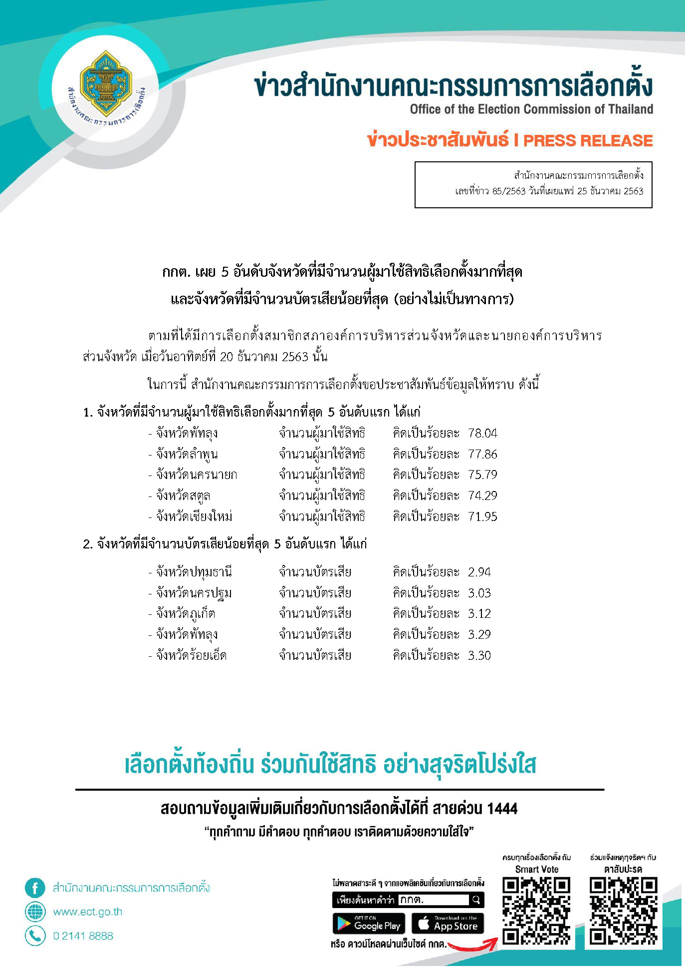 1. จังหวัดที่มีจำนวนผู้มาใช้สิทธิเลือกตั้งมากที่สุด 5 อันดับแรก ได้แก่ จังหวัดพัทลุง ,จังหวัดลำพูน , จังหวัดนครนายก , จังหวัดสตูล , จังหวัดเชียงใหม่