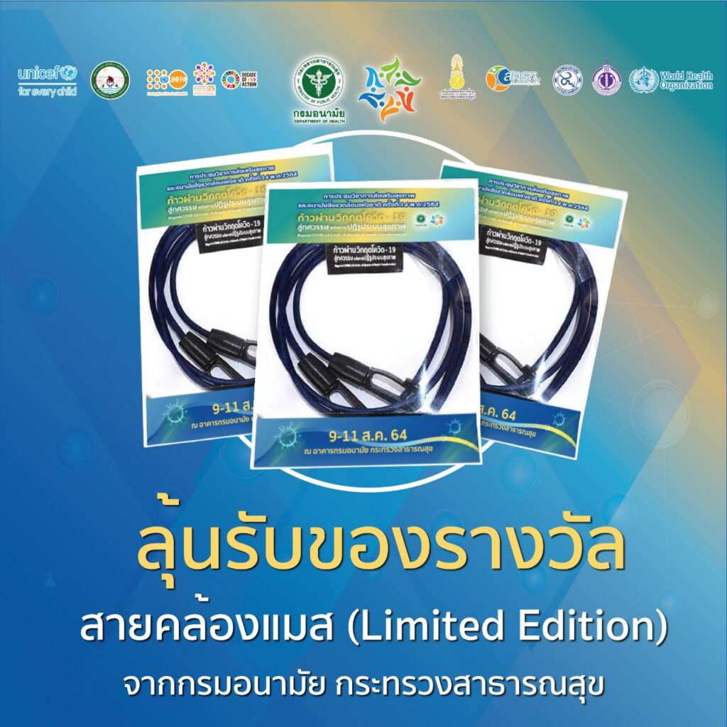 เพียงแค่กดไลค์เพจ กดไลค์และกดแชร์โพสต์นี้ รวมทั้งร่วมคอมเม้นต์ความคิดเห็น คำถาม หรือข้อสงสัย ลุ้นรับของรางวัล สายคล้องแมส รุ่น Limited Edition จากกรมอนามัย กระทรวงสาธารณสุข 100 ชิ้น ประกาศผลหลังเสร็จการประชุมวิชาการส่งเสริมสุขภาพและอนามัยสิ่งแวดล้อมแห่งชาติ ครั้งที่ 14 พ.ศ. 2564