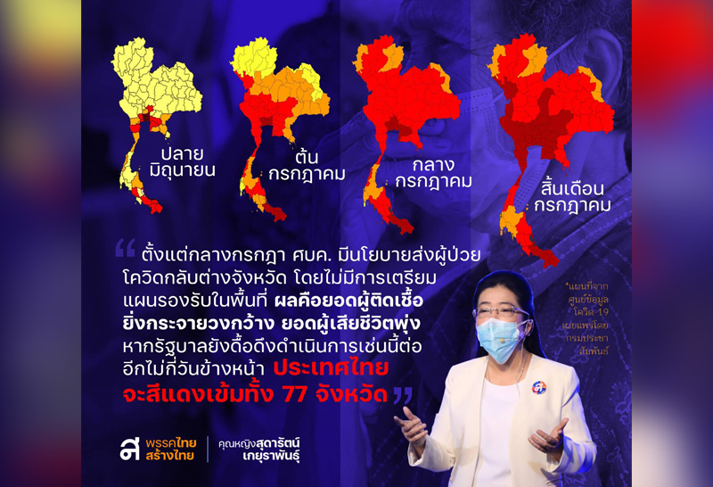 คุณหญิงสุดารัตน์ เกยุราพันธ์ ประธานพรรคไทยสร้างไทย กล่าวถึง นโยบายส่งผู้ป่วยโควิด-19 กลับบ้าน ตั้งแต่กลางเดือนกรกฎาคมเป็นต้นมา โดยไม่มีการเตรียมมาตราการรองรับว่า ผลที่ตามมาคือ ยอดผู้ติดเชื้อพุ่งสูงขึ้น และไม่มีแนวโน้มว่าจะลดลง ยอดผู้เสียชีวิตเพิ่มขึ้นตามลำดับ ประชาชนต้องถูกบังคับให้หยุดทำมาหากินด้วยมาตรการ Lock down เพิ่มขึ้นอีกหลายจังหวัด และต้องใช้ระยะเวลาในการ Lock down อีกนาน เพราะมาตรการของรัฐบาลได้ทำให้เชื้อกระจายไปทั่วประเทศ จนน่าตกใจ