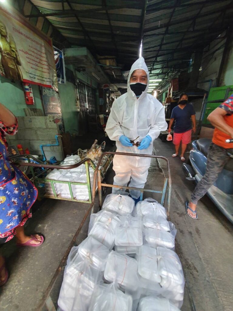 หนุ่มโบ๊ต-ธีรพล เล่าความรู้สึกให้ฟังว่า .. “ประสบการณ์ในวันนี้เกิดโดยไม่ได้คาดคิดว่าจะได้มาลงพื้นที่ เพราะความตั้งใจแรก ผมจะนำข้าวกล่องที่เพื่อนๆ พี่น้องช่วยกันสมทบทุนมา ซึ่งตรงกับที่ผมเปิดขายข้าวกะเพรา 20 บาทด้วยพอดี เขาก็เลยให้ผมจัดการเป็นสะพานบุญในการทำข้าวกล่องไปบริจาค ซึ่งตอนผมไปถึงตรงกับเวลาที่ทีมจิตอาสาจะออกแจกจ่ายอาหารพอดี ผมเลยได้โอกาสลงพื้นที่ด้วยเลย เป็นครั้งแรกของผมนะครับ เพียงแค่ครึ่งวันที่ผมใส่ชุด PPE มาลงพื้นที่จริง เหนื่อยนะครับ แต่รู้สึกดีมากๆ ที่เราได้ช่วยเหลือคนที่กำลังเดือดร้อน และทำให้เรารู้เลยว่าบุคลากรทางการแพทย์และ ทุกคนที่ทำงานเพื่อประชาชน ต้องเหนื่อยมากแค่ไหน ถ้าใครพอมีกำลังหรือไม่ลำบาก พอที่จะช่วยบริจาคกันได้คนละเล็กคนละน้อย ไม่ว่าจะเป็นอาหาร อุปกรณ์ทางการแพทย์ที่ช่วยป้องกันโควิด อยากให้ช่วยกันครับ ผมและเพื่อนๆ วง 7 Days Crazy ขอเป็นกำลังใจให้พี่ๆ อาสาสมัคร บุคลกรทางการแพทย์ และผู้ที่กำลังเดือดร้อนทุกคนสู้ๆ ครับ”