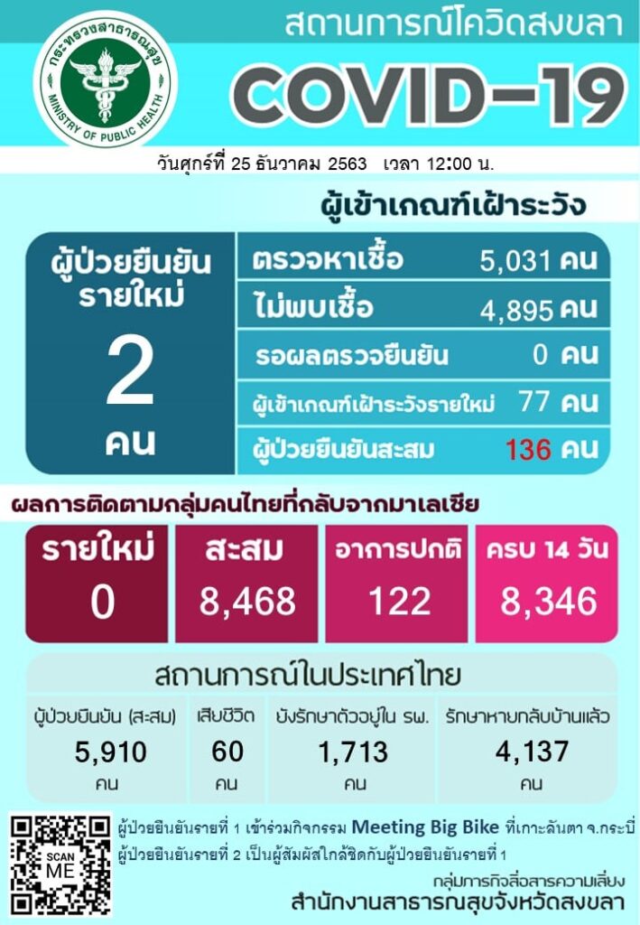 วันนี้ (25ธ.ค.63) ที่ห้องประชุม 1 ศาลากลางจังหวัดสงขลา นายนิพนธ์ บุญญามณี รัฐมนตรีช่วยว่าการกระทรวงมหาดไทย พร้อมด้วย นายจารุวัฒน์ เกลี้ยงเกลา ผู้ว่าราชการจังหวัดสงขลา ประชุมติดตามวางแผนรับมือการระบาดของโควิด-19 อย่างใกล้ชิดหลังสงขลาพบผู้ป่วยยืนยันติดเชื้อโควิด-19 แล้ว จำนวน 2 ราย โดยผู้ป่วยยืนยันรายที่ 1 กลับจากเข้าร่วมกิจกรรม Meeting Big Bike ที่เกาะลันตา จังหวัดกระบี่และผู้ป่วยยืนยันรายที่ 2 เป็นผู้สัมผัสใกล้ชิดกับผู้ป่วยยืนยันรายที่ 1 ขณะนี้เข้ารับการรักษาอยู่ที่โรงพยาบาลและอยู่ในการดูแลของแพทย์อย่างใกล้ชิด ส่วนผู้ที่สัมผัสใกล้ชิด เบื้องต้นอยู่ระหว่างดำเนินการสอบสวนโรคและตรวจสอบรายละเอียดต่างๆ เพื่อค้นหาผู้สัมผัสใกล้ชิดกับผู้ป่วยต่อไป ด้านสถานการณ์แรงงานต่างด้าวจังหวัดสงขลามีแรงงานต่างด้าวทั้งหมด 35,817 คน และเจ้าหน้าที่กำลังเร่งตรวจคัดกรองและให้ความรู้เรื่องการป้องกันตัวเองจากโควิด-19ในกลุ่มแรงงานต่างด้าว นายนิพนธ์ บุญญามณี รัฐมนตรีช่วยว่าการกระทรวงมหาดไทย กล่าวว่าจังหวัดสงขลาถอดบทเรียนในห้วง 1 ปีที่ผ่านมา เพื่อรับมือสถานการณ์หากเกิดการระบาดระลอกใหม่ และขอความร่วมมือทุกภาคส่วนสวมหน้ากากอนามัยหรือหน้ากากผ้าทุกครั้งที่ออกจากที่พักปฏิบัติตนตามหลักการเว้นระยะห่างทางสังคม ล้างมือด้วยสบู่หรือเจลแอลกอฮอล์บ่อยครั้ง และให้ทุกคนเช็คอินผ่านแอปพลิเคชัน “ไทยชนะ” เมื่อเข้าไปใช้บริการในสถานประกอบการร้านค้า และสถานที่ต่างๆ ทุกครั้ง