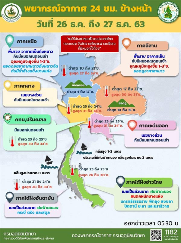 กรมอุตุนิยมวิทยา พยากรณ์อากาศ 24 ชั่วโมงข้างหน้า บริเวณความกดอากาศสูงหรือมวลอากาศเย็นที่ปกคลุมประเทศไทยตอนบนและทะเลจีนใต้มีกำลังอ่อนทำให้บริเวณดังกล่าวมีอุณหภูมิสูงขึ้น 1-3 องศาเซลเซียส กับมีหมอกในตอนเช้า แต่ยังคงมีอากาศเย็นถึงหนาวในภาคเหนือและภาคตะวันออกเฉียงเหนือส่วนบริเวณยอดดอยและยอดภูมีอากาศหนาวถึงหนาวจัดและมีน้ำค้างแข็งบางพื้นที่ ขอให้ประชาชนบริเวณประเทศไทยตอนบนระวังอัตรายสัญจรผ่านบริเวณที่มีหมอกไว้ด้วย สำหรับมรสุมตะวันออกเฉียงเหนือที่พัดปกคลุมอ่าวไทยและภาคใต้มีกำลังอ่อนลง ทำให้ภาคใต้ยังคงมีฝนตกหนักบางแห่ง สำหรับกรุงเทพมหานครและปริมณฑล มีหมอกในตอนเช้า อุณหภูมิต่ำสุด 23-25 องศาเซลเซียส อุณหภูมิสูงสุด 30-34 องศาเซลเซียสลมตะวันออกเฉียงเหนือ ความเร็ว 10-20 กม./ชม.