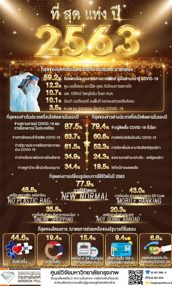 กรุงเทพโพลล์เผยผลสำรวจความคิดเห็นประชาชน ทั่วประเทศจำนวน 1,090 คน เรื่อง “ที่สุดแห่งปี 2563”พบว่าข่าวในประเทศที่สนใจและติดตามมากที่สุดแห่งปีร้อยละ 87.5 ระบุ ข่าวสถานการณ์ COVID-19 และการล็อกดาวน์ ในประเทศไทย รองลงมาร้อยละ 63.7 ระบุ ข่าวสาวลักลอบเข้าไทย ติด COVID -19 ร้อยละ 61.5 ระบุ ข่าวรัฐบาลประกาศเยียวยาประชาชนช่วง COVID-19 ขณะข่าวต่างประเทศที่สนใจและติดตาม มากที่สุดแห่งปี พบว่า ร้อยละ 79.4 ระบุ ข่าวผู้ติดเชื้อ COVID -19 ทั่วโลก รองลงมาร้อยละ 60.6 ระบุ การคิดค้นวัคซีนป้องกัน COVID -19 ร้อยละ 52.3 ระบุ การเลือกตั้งประธานาธิบดีสหรัฐอเมริกา เมื่อถามถึงบุคคลในสังคมไทยที่น่าชื่นชมและน่ายกย่องที่สุดแห่งปี พบว่า ร้อยละ 59.2 ระบุ ทีมแพทย์และบุคลากรทางการแพทย์ ผู้เป็นด่านหน้าสู้ COVID -19 รองลงมาร้อยละ 12.2 ระบุ ตูนบอดี้สแลมและโน๊ต อุดม กับโครงการตลาดใจ เปิดรับบริจาคเพื่อซื้ออุปกรณ์ทางการแพทย์สำหรับ COVID -19 ร้อยละ 10.7 ระบุ นพ. ทวีศิลป์ วิษณุโยธิน โฆษก ศบค. ด้านมาตรการช่วยเหลือของรัฐบาลที่ท่านชื่นชอบมากที่สุดแห่งปี พบว่า ร้อยละ 44.6 ระบุ โครงการคนละครึ่ง รองลงมาร้อยละ 19.4 ระบุ โครงการเราไม่ทิ้งกัน ร้อยละ 15.4 ระบุ ลดค่าน้ำค่าไฟ และคืนเงินประกันค่าไฟและค่าน้ำ ท้ายที่สุดเมื่อถามถึง ที่สุดแห่งการเปลี่ยนรูปแบบการใช้ชีวิต ในปีนี้ พบว่า ร้อยละ 77.9 ระบุ การใช้ชีวิตแบบ new normal รองลงมา ร้อยละ 48.8 ระบุ งดใช้ถุงพลาสติก ลดโลกร้อน ร้อยละ 43.0 ระบุ การโอน-จ่ายเงิน ผ่านแอปฯ/สแกน QR Code