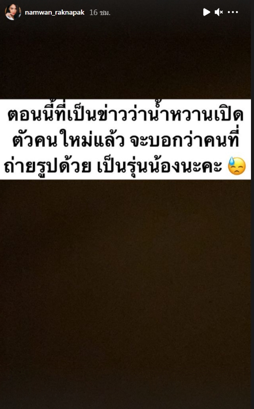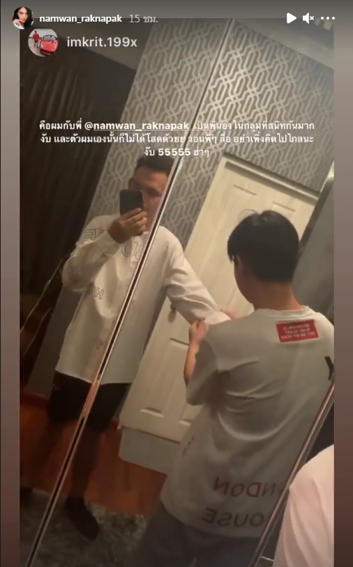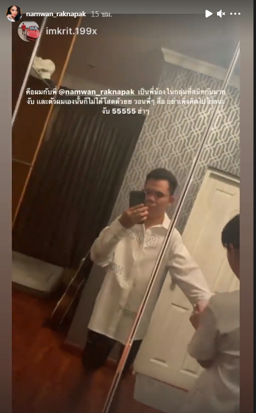 ขณะที่หนุ่มรุ่นน้องก็ได้โพสต์ไอจีสตอรี่ชี้แจงเรื่องนี้ว่า “คือผมกับพี่ @namwan_raknapak เป็นพี่น้อง ในกลุ่มที่สนิทกันมากงับ และตัวผมเองนั้นก็ไม่ได้โสดด้วยย วอนพี่! สื่อ อย่าเพิ่งคิดไปไกลนะงับ 55555 ฮ่าๆ”