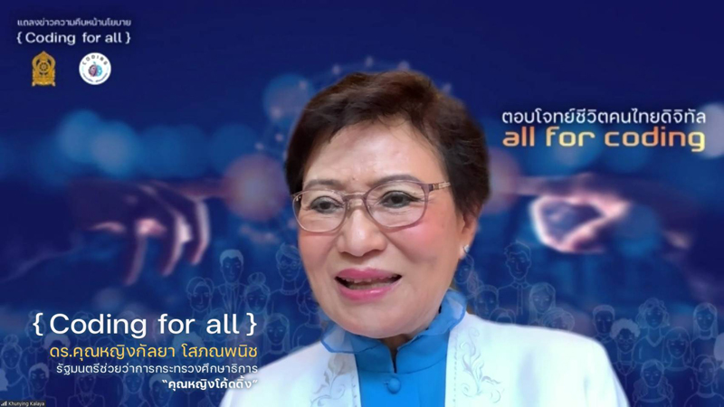 คุณหญิงกัลยา โสภณพนิช รัฐมนตรีช่วยว่าการกระทรวงศึกษาธิการ แถลงข่าวผ่านระบบ Zoom เพื่อชูนโยบาย Coding For All คือ ทางรอดสู้ทุกวิกฤต ตอบโจทย์ชีวิตคนไทยยุคดิจิทัล พร้อมเร่งเดินหน้าขับเคลื่อนนโยบายกระจายการเรียนรู้สู่ประชาชนทุกกลุ่ม พัฒนาหลักสูตร Coding สำหรับนักเรียน-นักเรียนพิเศษ-บุคคลทั่วไปในทุกกลุ่มอาชีพ