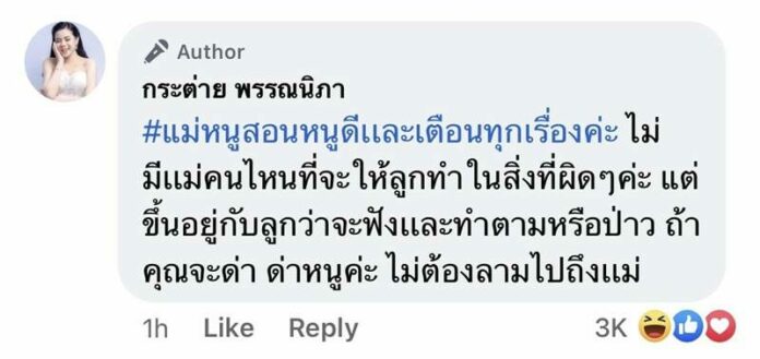 ซึ่งเจอทัวร์ถล่มยับถามหาถึงศีลธรรมต่างๆในการเลี้ยงดุอบรมสั่งสอนลูก จนเจ้าตัวได้ตอบกลับคอมเมนต์ว่า  “#แม่หนูสอนหนูดีเเละเตือนทุกเรื่องค่ะ ไม่มีเเม่คนไหนที่จะให้ลูกทำในสิ่งที่ผิดๆ ค่ะ แต่ขึ้นอยู่กับลูกว่าจะฟังเเละทำตามหรือป่าว ถ้าคุณจะด่า ด่าหนูค่ะ ไม่ต้องลามไปถึงเเม่”