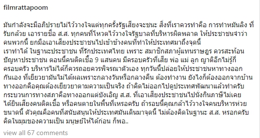 ให้ประชาชนจำว่าคนพวกนี้ ยกมือเอาเสียงประชาชนไปเข้าข้างคนที่ทำให้ประเทศมาถึงจุดนี้ เราทำได้ ในฐานะประชาชน ที่รักประเทศไทย เพราะสมาชิกสภาผู้แทนราษฎร ควรสะท้อนปัญหาประชาชน