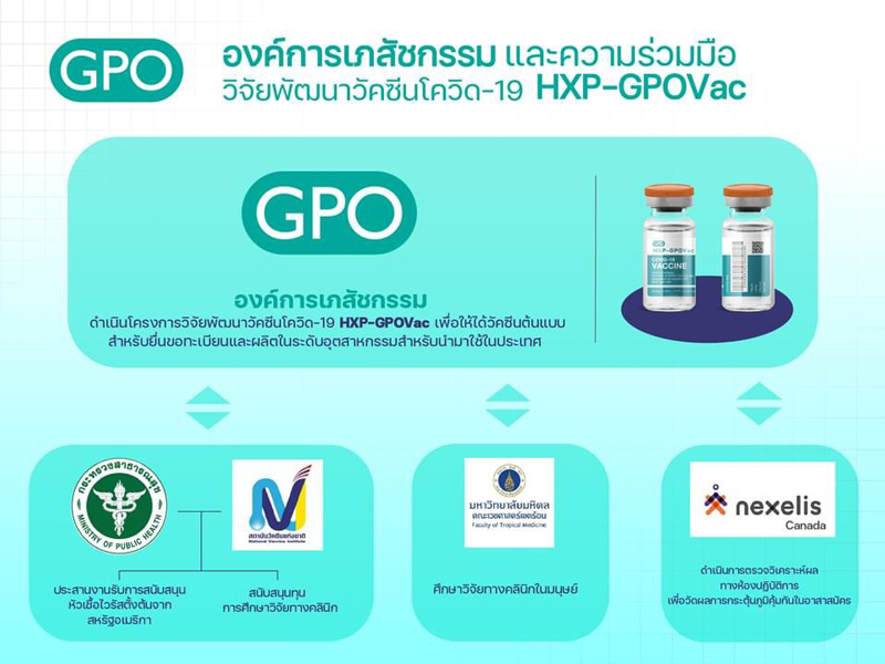 นายแพทย์วิฑูรย์ ด่านวิบูลย์ ผู้อำนวยการองค์การเภสัชกรรม กล่าวว่า หลังจากที่องค์การเภสัชกรรมได้ดำเนินการวิจัยพัฒนากระบวนการผลิตวัคซีน และได้ทำการผลิตวัคซีนป้องกันโควิด HXP–GPOVac จนสำเร็จในขั้นแรก และนำเข้าสู่ขั้นตอนของการศึกษาวิจัยในมนุษย์ นับเป็นวัคซีนโควิดชนิดแรกของประเทศไทย ที่ได้วิจัยในมนุษย์ ซึ่งขณะนี้การศึกษาวิจัยในมนุษย์ในระยะที่ 1 ได้ผลการวิเคราะห์ภูมิคุ้มกันที่ 14 วัน หลังจากได้รับวัคซีนครบ 2 เข็มแล้ว