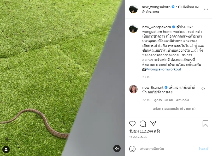 ทำเอาแฟนๆถึงกับตกอกตกใจเลยทีเดียว หลังจากพระเอกหนุ่ม นิว วงศกร ปรมัตถากร ได้โพสต์คลิปขณะที่งูตัวเป็นๆเลื้อยเข้ามาสนามในบ้านลงอินตราแกรมส่วนตัว พร้อมกับประกาศของดถ่ายคลิปออกกำลังกาย wongsakorn home workout เป็นการชั่วคราว เนื่องจากมีแขกไม่ได้รับเชิญเข้ามา