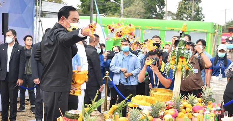 จากนั้น นายกรัฐมนตรี ทำพิธีวางไม้มงคล ผูกผ้าสี และโปรยดอกไม้เพื่อความเป็นสิริมงคล ณ บริเวณจุดยกเสาเอก