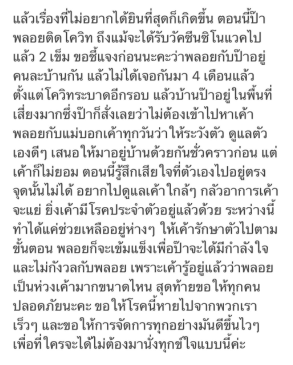 “แล้วเรื่องที่ไม่อยากได้ยินที่สุดก็เกิดขึ้น ตอนนี้ป๊าพลอยติดโควิด ถึงแม้จะได้รับวัคซีนซิโนแวคไปแล้ว 2 เข็ม ขอชี้แจงก่อนนะคะว่าพลอยกับป๊าอยู่คนละบ้านกัน แล้วไม่ได้เจอกันมา 4 เดือนแล้ว ตั้งแต่โควิดระบาดอีกรอบ แล้วบ้านป๊าอยู่ในพื้นที่เสี่ยงมาก ซึ่งป๊าก็สั่งเลยว่าไม่ต้องเข้าไปหาเขา