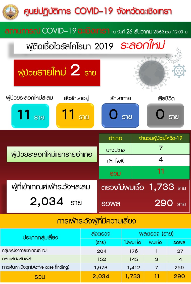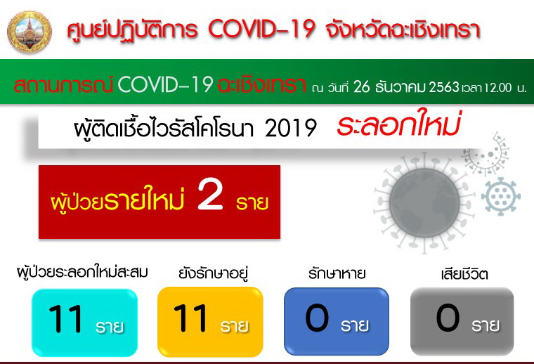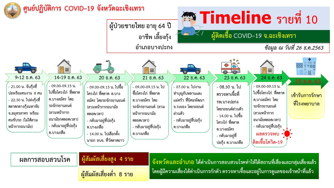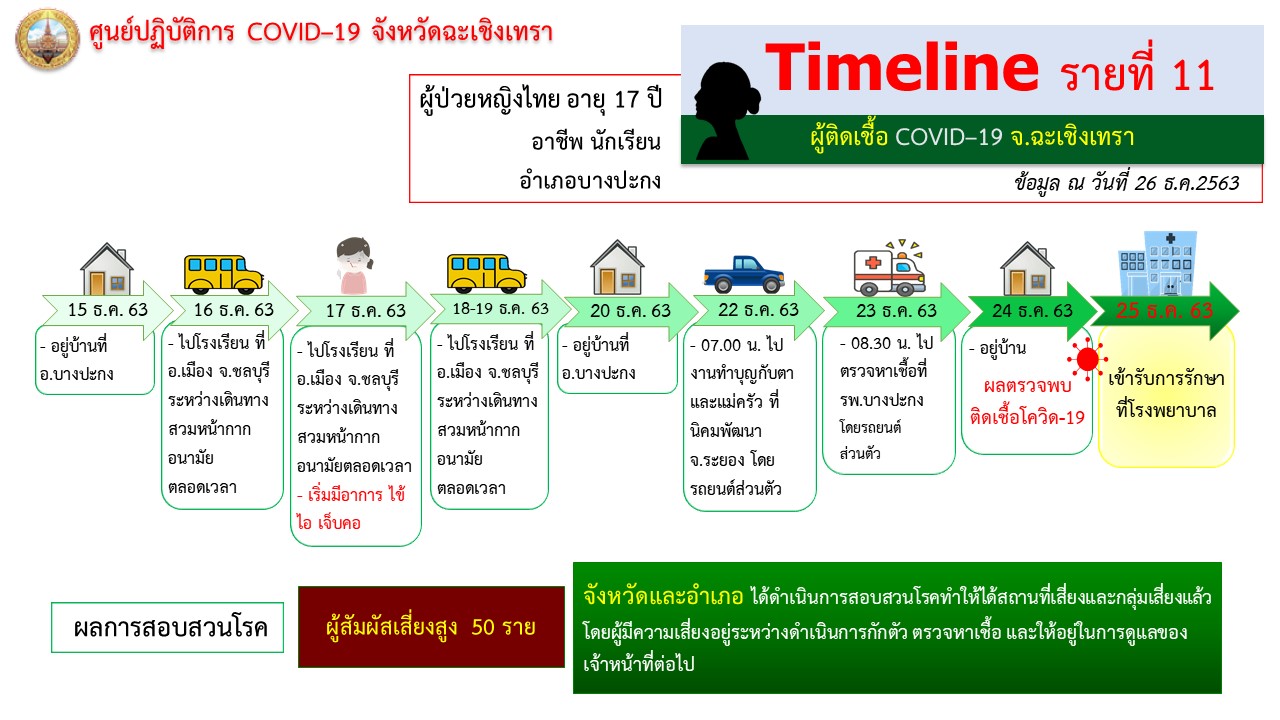 ผู้สื่อข่าวได้รับการเผยแพร่ขอมูลจากศูนย์ปฏิบัติการโควิด 19 จ.ฉะเชิงเทรา ผ่านทางสำนักงานประชาสัมพันธ์จังหวัดว่า ในวันนี้ที่ จ.ฉะเชิงเทรา มีการยืนยันถึงผลการตรวจหาเชื้อโควิด 19 ว่ามีผู้ติดเชื้อเพิ่มเติมอีกจำนวน 2 ราย เป็นตาและหลานสาว วัย 64 ปี และ 17 ปี ชาว ต.บางเกลือ อ.บางปะกง จ.ฉะเชิงเทรา ซึ่งเป็นผู้ที่เดินทางไปส่งกุ้งจากบ่อเลี้ยงนำไปขายยังที่แพกุ้งในตลาดกลางมหาชัย จ.สมุทรสาคร โดยมีไทม์ไลน์ดังนี้ วันที่ 9-12 ธ.ค.63 ระหว่างเวลา 21.00 น.- 22.30 น. ของทุกวันจะจับกุ้งที่บ่อเลี้ยงใน ต.บางเกลือ พร้อมด้วยคนงาน 8 คน ก่อนนำกุ้งไปส่งยังที่แพกุ้งในตลาดกลางมหาชัย โดยมีคนขับรถไปด้วย 1 คนไม่ได้สวมหน้ากากอนามัย วันที่ 14-19 ธ.ค.63 เวลา 09.00-09.15 ไปซื้อโครงไก่ ที่ตลาดใน ต.บางสมัคร อ.บางปะกง จ.ฉะเชิงเทรา โดยใช้รถ จยย. แต่สวมหน้ากากอนามัยอยู่ตลอดเวลา   วันที่ 20 ธ.ค.63 ไปซื้อโครงไก่ตามเวลาปกติ และเดินทางไปเลือกตั้งนายก และ ส.อบจ. ที่หน่วยเลือกตั้งวัดลาดยาว ต.บางเกลือ ในเวลา 14.00 น. วันที่ 21 ธ.ค.63 เวลา 09.00 -09.15 ไปซื้อโครงไก่ตามปกติ และกับมาอยู่ที่บ่อกุ้งใน ต.บางเกลือ ตามวิถีเดิมแบบเดียวกันทุกวัน วันที่ 22 ธ.ค.63 เดินทางไปงานบุญกับหลานสาววัย 17 ปีพร้อมแม่ครัวยังที่ อ.พัฒนานิคม จ.ระยอง โดยรถยนต์ส่วนตัว วันที่ 23 ธ.ค.63 เวลา 08.30 น. เดินทางเข้าไปตรวจหาเชื้อโควิด 19 ยังที่ รพ.บางปะกง โดยรถยนต์ส่วนตัว เวลา 14.00 น.ไปซื้อโครงไก่ที่ตลาดบางสมัคร และกลับเข้ามาอยู่บ่อกุ้งตามปกติ วันที่ 24 ธ.ค.63 เวลา 09.00-09.15 น.ไปซื้อโครงไก่ตามปกติที่ตลาดบางสมัครก่อนกลับมาอยู่ที่บ่อกุ้ง และทราบผลการตรวจพบเชื้อโควิด 19 วันที่ 25 ธ.ค.63 เข้าไปรับการรักษาตัวยังที่ รพ.บางปะกง โดยมีผู้สัมผัสใกล้ชิดและมีความเสี่ยงสูงจำนวน 4 ราย ผู้สัมผัสความเสี่ยงต่ำ 8 ราย ส่วนไทม์ไลน์ของหลานสาววัย 17 ปีนั้นวันที่ 16 ธ.ค.63 เดินทางไปโรงเรียนใน อ.เมือง จ.ชลบุรี ระหว่างนั่งรถเดินทางสวมหน้ากากอนามัยตลอดเวลา วันที่ 17 ธ.ค.63 ยังคงเดินทางไปโรงเรียนเช่นเดิม แต่เริ่มมีอาการไข้ ไอ เจ็บคอ วันที่ 18-19 ธ.ค.63 ยังคงเดินทางไปโรงเรียนตามปกติ และระหว่างเดินทางสวมหน้ากากเหมือนทุกครั้ง วันที่ 20-21 ธ.ค.63 อยู่กับบ้าน วันที่ 22 ธ.ค.63 เวลา 07.00 น.เดินทางไปยังที่ อ.พัฒนานิคม จ.ระยอง พร้อมกับผู้เป็นตาและแม่ครัว วันที่ 23 ธ.ค.63 เวลา 08.30 น.ไปตรวจหาเชื้อโควิด 19 ที่ รพ.บางปะกง วันที่ 24 ธ.ค.63 ทราบผลการพบเชื้อและเป็นผู้ป่วยโควิด 19 วันที่ 25 ธ.ค.63 เข้ารับการรักษาพยาบาลใน รพ.บางปะกง โดยมีผู้สัมผัสโรคที่มีความเสี่ยงสูงมากถึง 50 คน เนื่องจากได้เดินทางไปโรงเรียน ซึ่งทั้งสองรายถือเป็นผู้ป่วยโควิด 19 รายที่ 10 และ 11 ที่ม