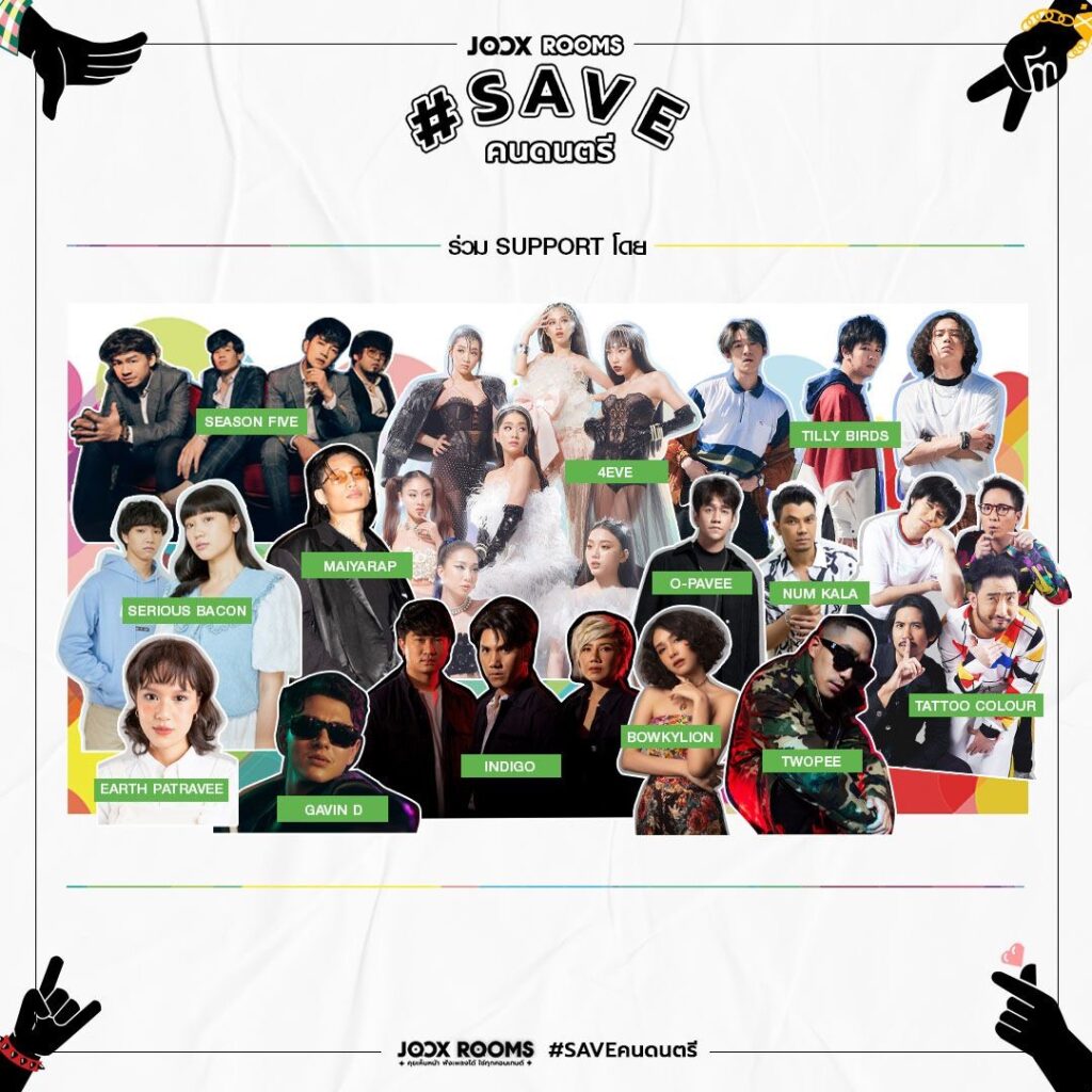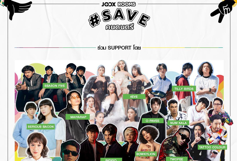 เราจะสู้ไปด้วยกัน! ท่ามกลางวิกฤตโควิด-19 ที่ส่งผลกระทบต่อทุกสาขาอาชีพโดยเฉพาะกลุ่มคนดนตรี ที่ไร้เวทีในการสร้างความสุขให้แฟนเพลง  JOOXในฐานะแอปมิวสิคคอมมูนิตี้สำหรับคนรักเสียงเพลงอันดับ 1 ของไทย ขอร่วมส่งต่อกำลังใจช่วยเหลือเหล่าคนดนตรีที่ต้องสูญเสียรายได้จากสถานการณ์โควิด-19กับเทศกาลดนตรีออนไลน์แห่งยุค  #Saveคนดนตรี ให้ดนตรี ช่วยคนดนตรีที่ใช้ฟีเจอร์ JOOX ROOMS เปิดเวที ชวนพี่น้อง และคนดนตรีอิสระ ทั้งเดี่ยวและกลุ่มทั้งหมด 85 วง มาไลฟ์คอนเสิร์ตสด ๆ เสิร์ฟความสุขแบบเต็มถึงบ้านโดยยังคงรักษาระยะห่างทางสังคม
