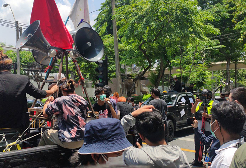 เมื่อเวลา 12.25 น. ทะลุฟ้าในกิจกรรม #ม็อบ20สิงหา Car mob สัญจร ยื่นหนังสือทะลุโลก เคลื่อนขบวนถึง สถานเอกอัครราชทูตสหรรัฐอเมริกา เพื่อร้องเรียนเกี่ยวกับกรณีการจัดสรรวัคซีนที่ได้รับมอบจาก รัฐบาลอเมริกา แต่รัฐบาลไทยกลับมีการนำวัคซีนไปแจกจ่ายแก่กำลังพลในกองทัพแทนที่จะเป็นบุคคลากรทางการแพทย์ด่านหน้าเพื่อรับมือกับโรคระบาดโควิด-19 โดยทางสถานเอกอัครราชทูตสหรัฐอเมริกาได้ส่งตัวแทนมารับหนังสือจากกลุ่มผู้ชุมนุมไว้เพื่อพิจารณา
