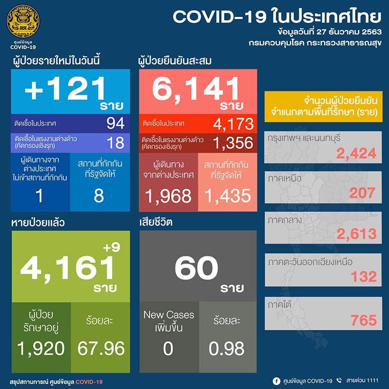 นายแพทย์ทวีศิลป์ วิษณุโยธิน โฆษกศูนย์บริหารสถานการณ์ โควิด-19 หรือ ศบค. เปิดเผยตัวเลขประจำวันที่ 27 ธ.ค.63 ว่า สถานการณ์ ปัจจุบันประเทศไทยอยู่อันดับที่ 142 ของโลก พบผู้ป่วยใหม่ 121 ราย พบติดเชื้อในประเทศ 94 ราย พบติดเชื้อในแรงงานต่างด้าวคัดกรองเชิงรุก 18 ราย รักษาหายกลับบ้านแล้ว 4,161 ราย ยืนยันผู้ป่วยสะสม 6,141 ราย พบติดเชื้อในประเทศรวม 4,173 ราย ติดเชื้อในแรงงานต่างด้าวคัดกรองเชิงรุกรวม 1,356 ราย รักษาอยู่ 1,902 คน รวมถึงผู้ป่วยจังหวัดระยอง 49 รายอยู่ระหว่างรอยืนยันผลทางห้องปฏิบัติการ และเสียชีวิตรวม 60 คน เป็นผู้ป่วยที่เดินทางมาจากต่างประเทศไม่เข้าสถานที่กักกัน 1 ราย และผู้ที่เดินทางมาจากต่างประเทศเข้า State Quarantine 8 ราย